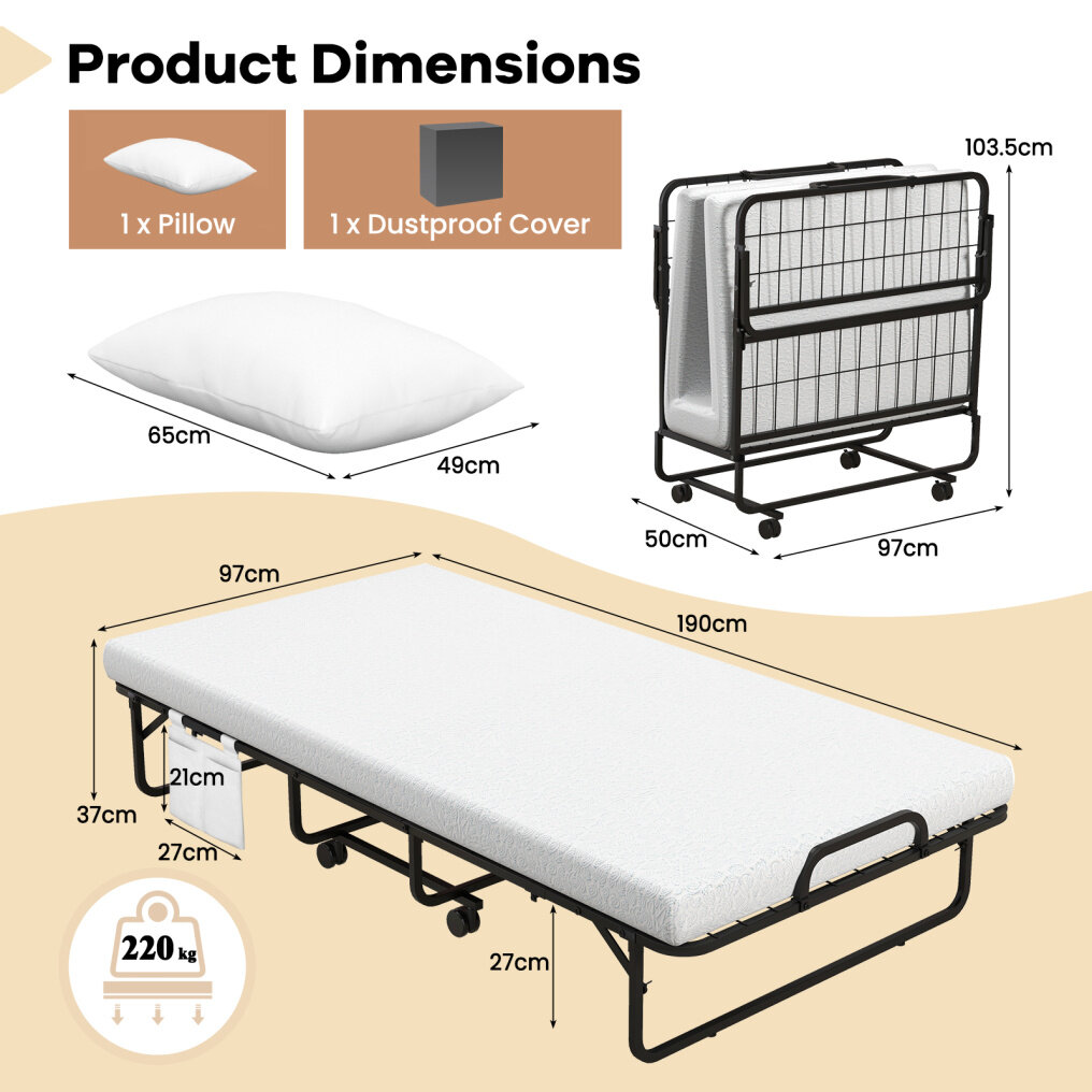 Package Includes: 1 x Twin Size Folding Bed; 1 x Mattress; 1 x Pillow; 1 x Dustproof Cover; 1 x User Guide
