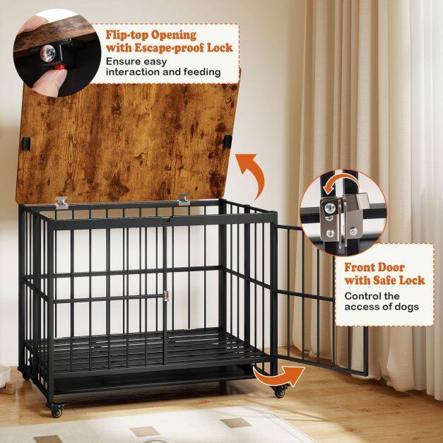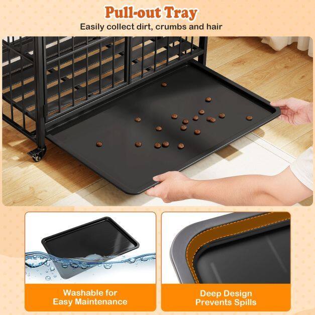 ● Secure Entries & Removable Tray: The metal dog kennel includes a top door for convenient interaction and a front door for easy access. All doors come with secure locks to prevent any escapes. It also features a washable removable tray to collect pet's hair or dirt. Additionally, the washable removable tray with 1.2" deep design prevents spills, ensuring a clutter-free floor.