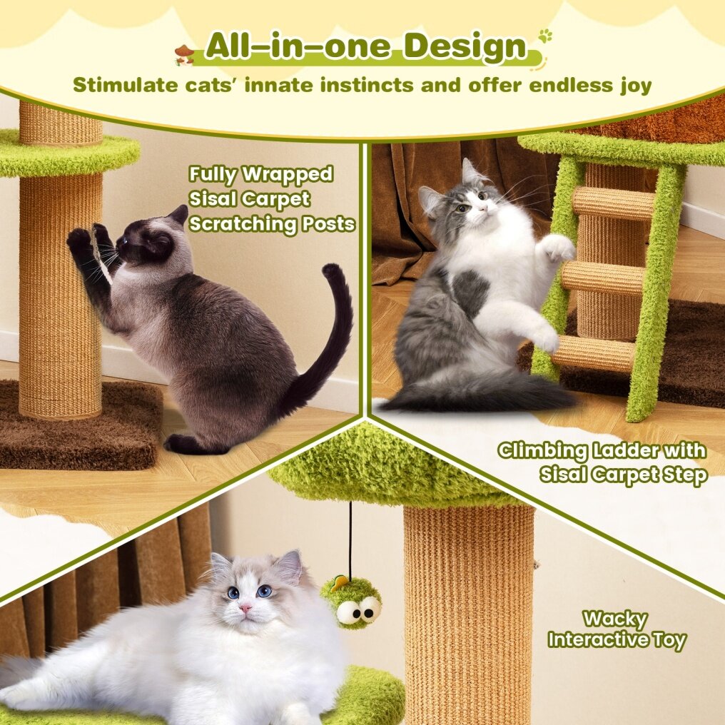 ● Entertaining Play Center: To nurture your cat's hunting instincts and keep them engaged, the multi-level cat tree includes a funny interactive toy that promises endless fun. Coupled with a sisal-covered ladder, it encourages exercise, keeping your cat both physically and mentally active.