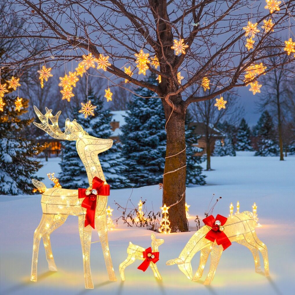 【3-Piece Christmas Deer】This 3-piece deer family set consists of a deer, a doe and a fawn with festive details like delicate bows. As the combination of these elements is festive, place this Christmas decoration in your yard to welcome friends with warm wishes.