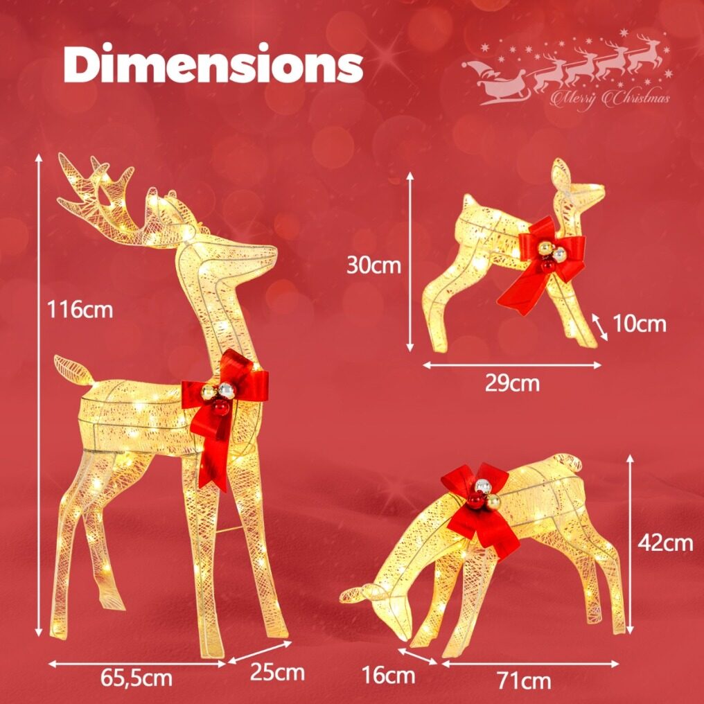 【Indoor/Outdoor Christmas Decoration】This lighted deer family set is an eye-catching Christmas decoration in your yard, porch, or garden. It is an ideal Christmas gift for your friends and family. Deer size: 25.9 x 10 x 45.7 inches, Doe size: 28 x 6.3 x 16.5 inches, Fawn size: 11.4 x 4 x 11.8 inches.
