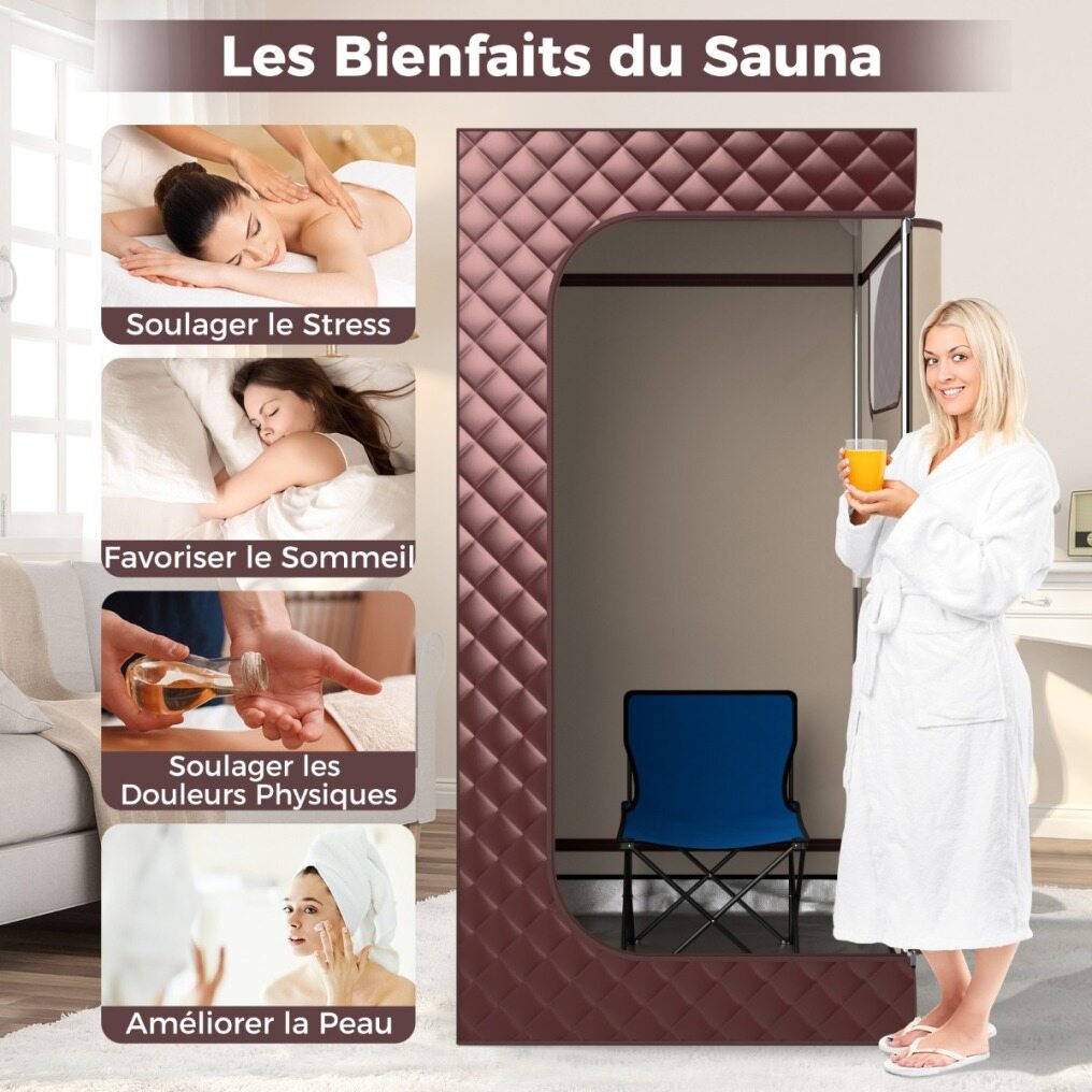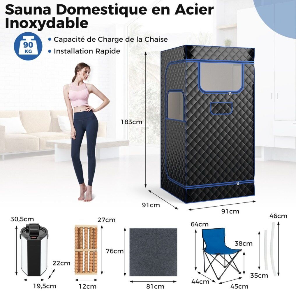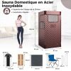 The stainless steel sauna has a 9-level timer ranging from 15 min to 90 min