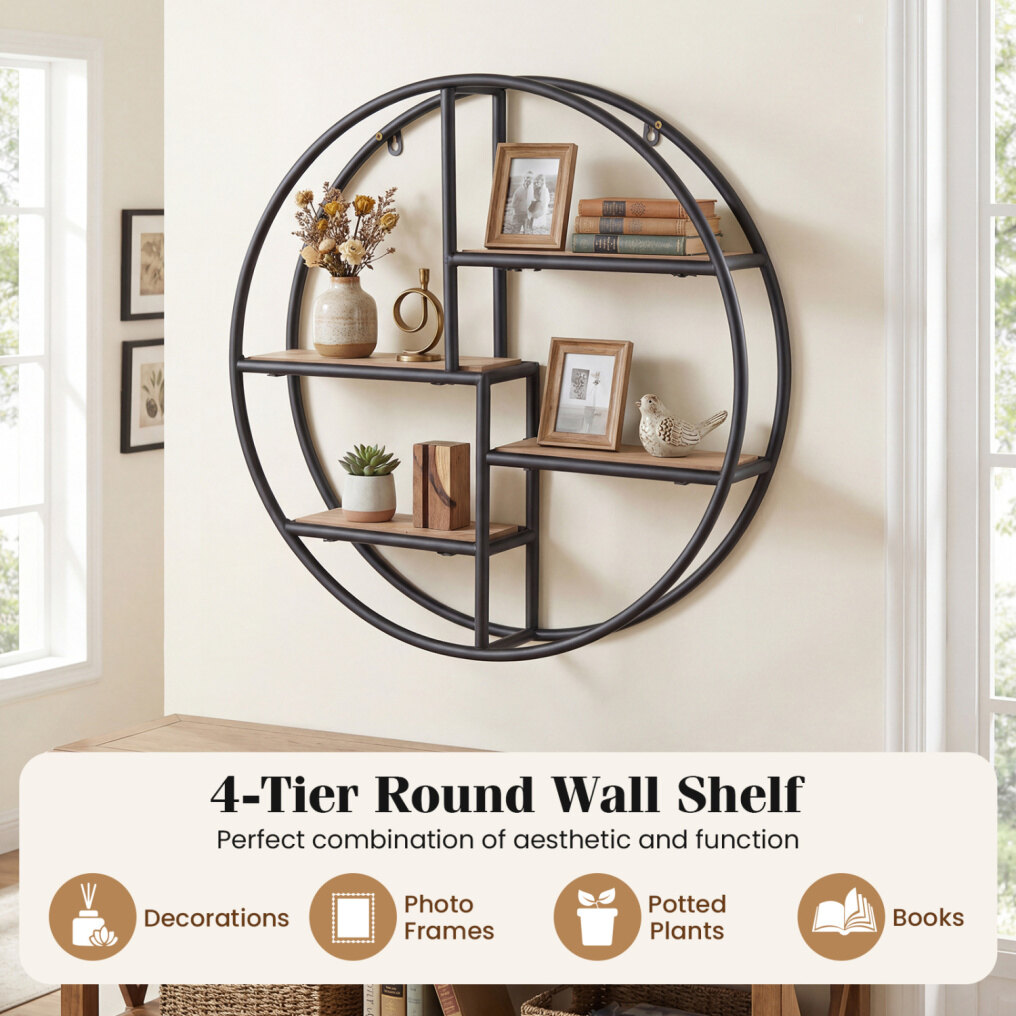 ● Smart Wall-Mounted Setup: Designed to make full use of vertical space, this 4-tier round wall shelf features 4 convenient hanging holes, and 4 pairs of hanging kits are included. The wall-mounted design keeps your floors free and clutter minimized.