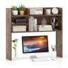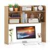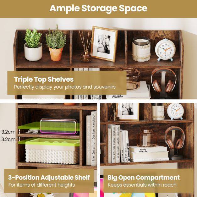 Ample Storage Space: The desktop bookshelf offers a streamlined solution to manage clutter with 3 upper shelves, 2 side compartments, and a big open compartment. It’s perfect for storing books, photos, clocks, and other essentials, maintaining a tidy and organized desktop.