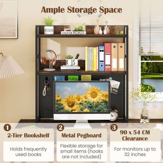 Optimized Space Utilization: This desktop bookshelf features 2-tier shelves, maximizing the use of tabletop vertical space. The space under the shelf measures 90 x 54 cm, providing ample room for computer monitors up to 32”.