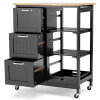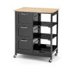 Still worried about the messy kitchen? Our kitchen island on wheels can solve your problem. There are 3 deep drawers available for tucking away various sundries, 2 open shelves for storing frequently-used items and a removable tray for transporting meals conveniently. You can customize arrangement of the drawer, tray and shelves. They can be placed in different position, either right of left, upper or lower as you want. The rubber wood countertop coated with waterproof painting ensure long-term use. With smooth rolling casters, you can move the trolley to the kitchen, dining room or garden with ease. And the casters with brakes can prevent it from sliding.
