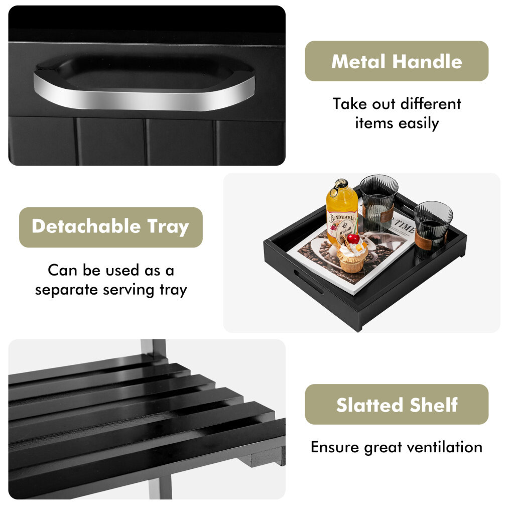 Removable Tray & Open Shelves: The removable tray with handles can used separately and is easy to carry, which is a good helper when you serve food and drinks from kitchen to other places. Besides, you can put some frequently-used items on the open shelves for easy access. Even better, these shelves and serving tray can be freely rearranged.