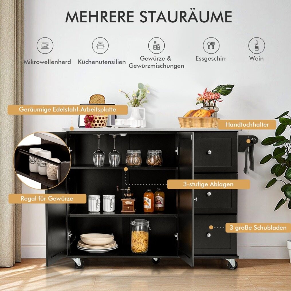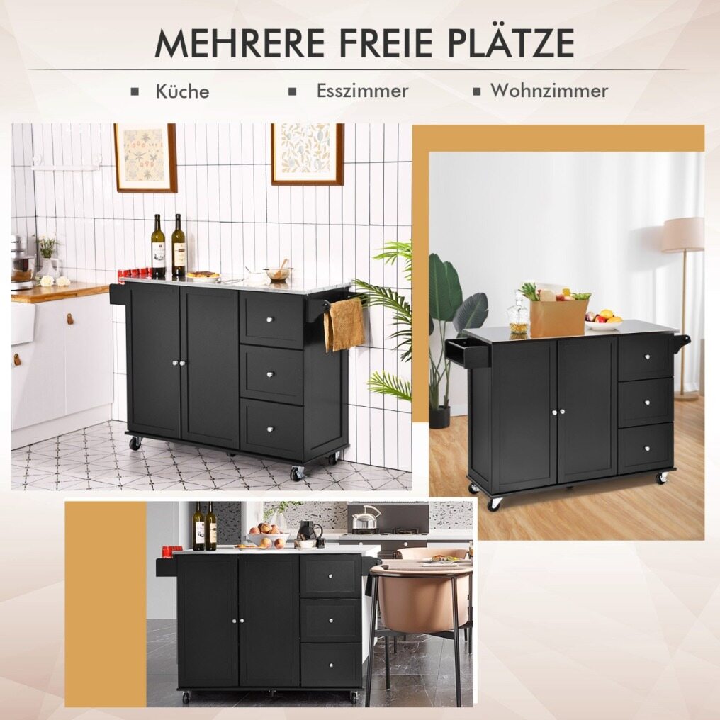Smooth-running universal wheels: So that you can move the kitchen island more easily or use it as a serving trolley. There are 5 universal wheels on the bottom, 2 of which have brakes. You can attach and move the kitchen cart in any room at any time. The towel holder can also be used as a handle.
