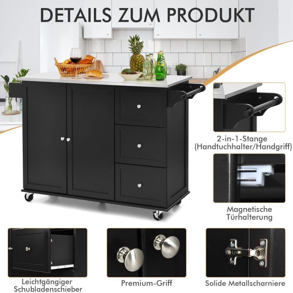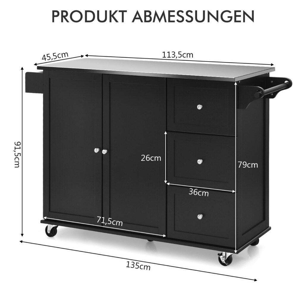 Selected Materials: Our kitchen islands are made from durable MDF and engineered engineered wood for sturdy construction and longevity. In addition, the wide worktop is made of stainless steel, which is smooth and waterproof and can be cleaned with a damp cloth.