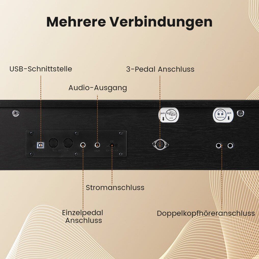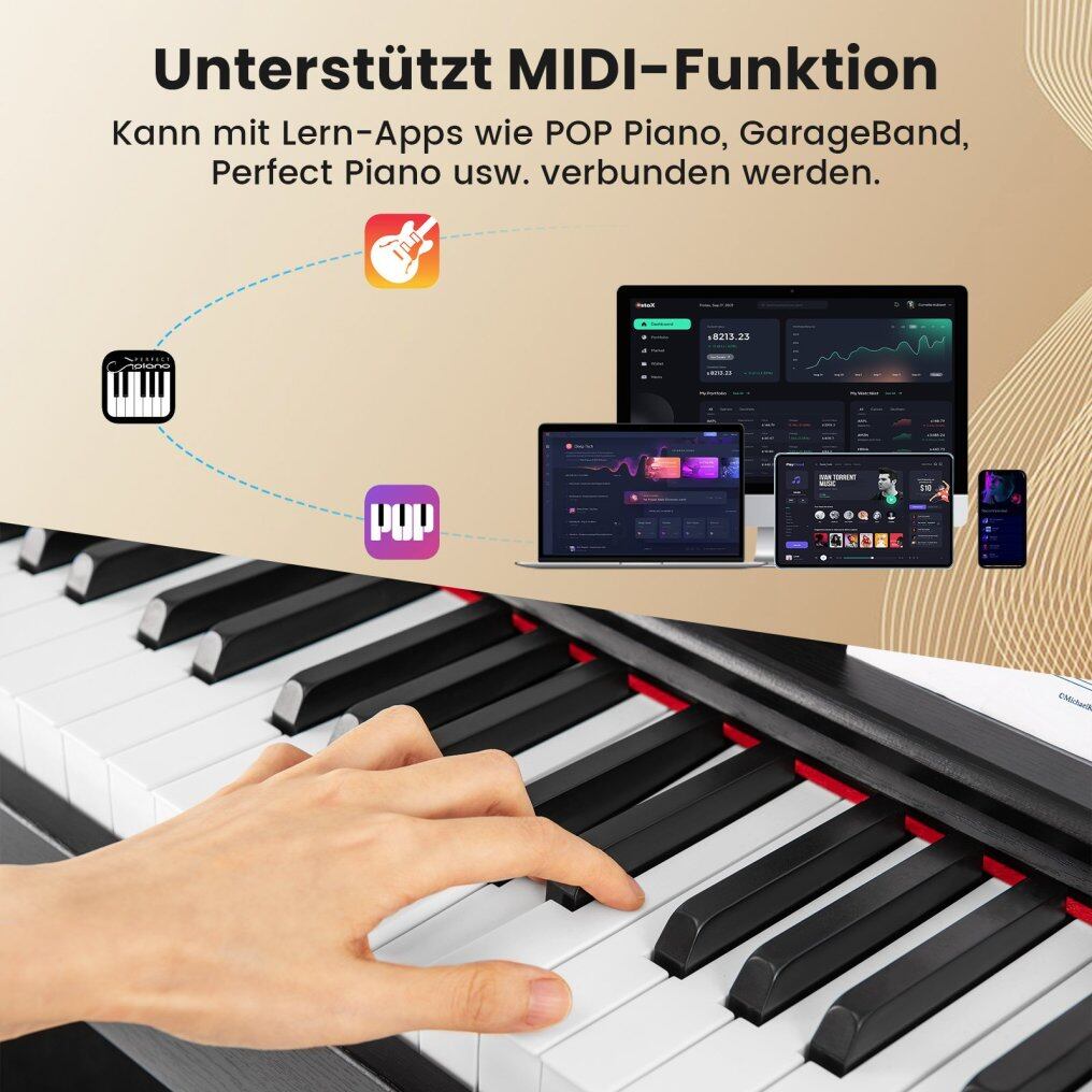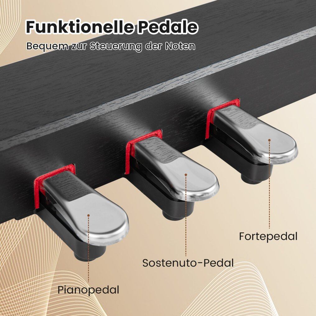 Triple Pedals & USB MIDI Port: There are three pedals: a soft pedal to soften the sound, a sostenuto pedal to hold specific notes, and a sustain pedal to make the piano tones ring out. Thanks to the USB MIDI function, the electronic piano can be connected to various devices, including computers and phones.