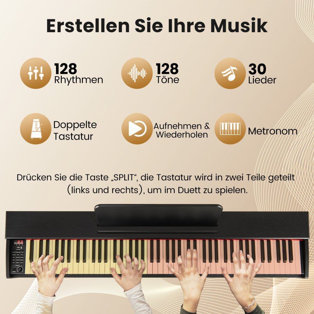 Dual keyboard for duet playing: You can press the "Split" button to activate the dual keyboard mode for duet playing, making it an ideal option for efficient teaching. The dual keyboard mode also offers two different tones for a band performance.