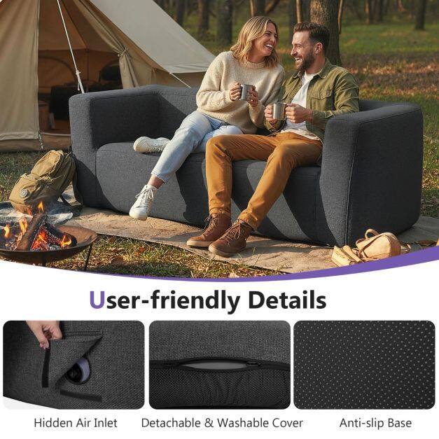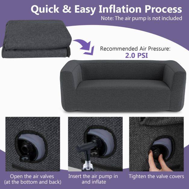 Quick and Easy Inflation: Equipped with two hidden air valves (bottom and rear), this sofa is easy to inflate. Simply open the valves, insert an air pump (not included), inflate, and close the valve covers tightly. Recommended air pressure: 0.15 bar.