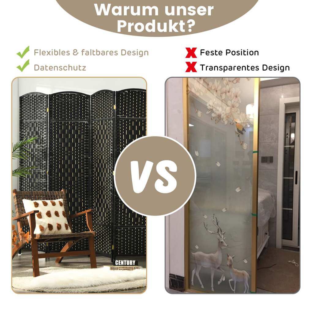 Space-saving efficiency: When not in use, this room divider can be folded compactly and stored in corners – a practical space-saving solution without compromising on style. Ideal for multifunctional or smaller rooms.