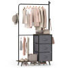 Made with a sturdy metal frame for added stability, this freestanding organizer features two hanging rails, three side hooks, and two wooden shelves, providing ample space for both hanging and folded clothes. Additionally, the fold-down fabric drawers have easy-grip handles, offering a convenient storage solution and saving space when not in use. With an industrial touch, this clothes rack is a versatile solution, perfect for the bedroom, entryway, or laundry room. For added peace of mind, an anti-fall device is integrated for enhanced safety.
