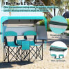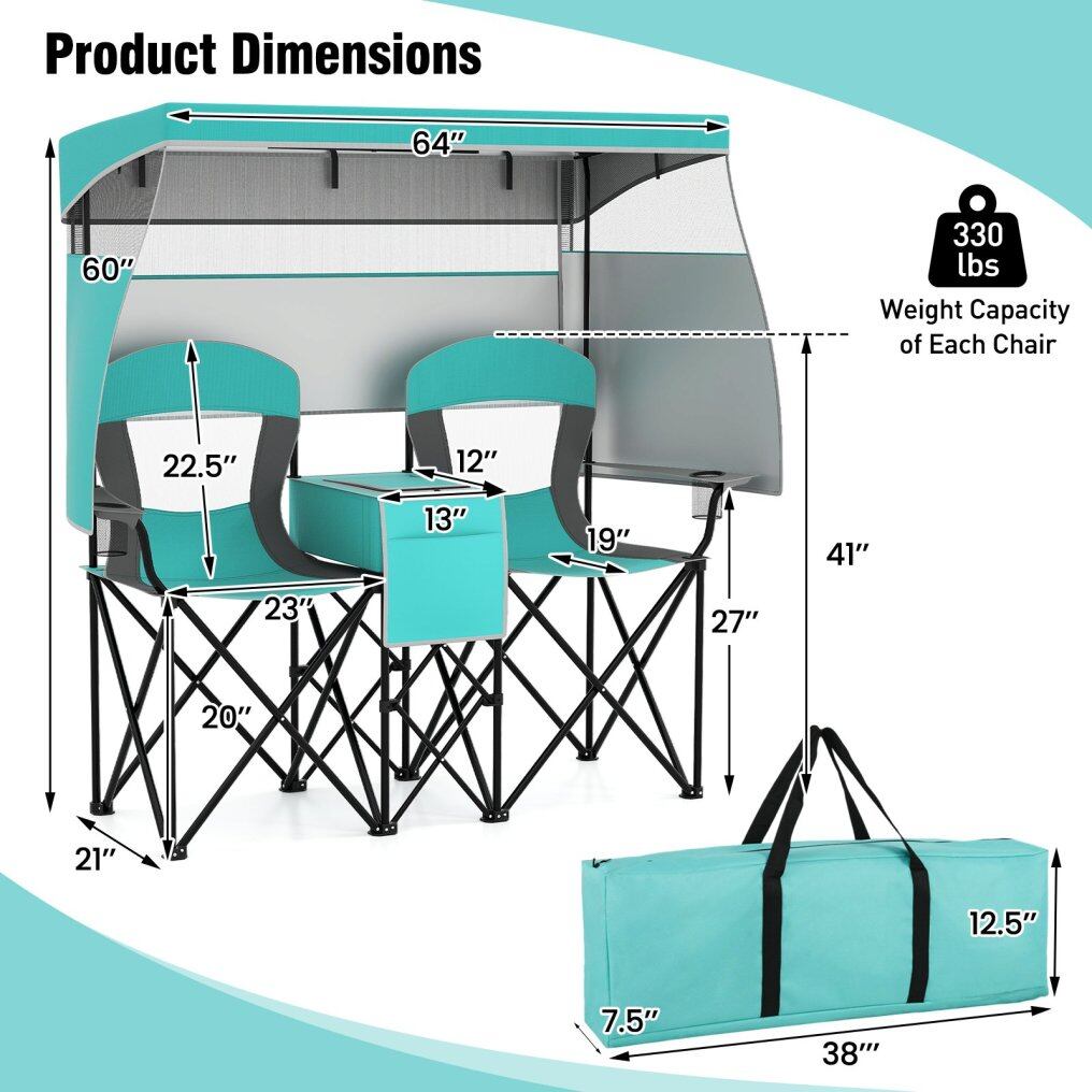 This double beach chair measures 163 x 72 x 153 cm (L x W x H) and comes with 2 spacious seats, ideal for enjoying outdoor leisure time with your beloved one. Moreover, it folds effortlessly and includes a portable carrying bag for convenient storage and transportation, thus you can easily carry it anywhere you want, from beaches to campsites and even sporting events. Designed to offer superior sun protection, our camping chair features a UPF50+ silver-coated canopy that can be adjusted to shield you from the sun's rays, complete with 2 side shades and a back flap for additional coverage. 3 shading curtains can be rolled up, while the canopy is detachable, meeting different needs. For enhanced reliability and stability, the chair is supported by a robust metal frame and crafted from a thickened oxford seat, complete with large footpads, preventing sliding or sinking into the soft ground. Added features such as the middle cooler bag keep your refreshments cold, while the integrated cup and phone holders ensure your essentials are always within easy reach.