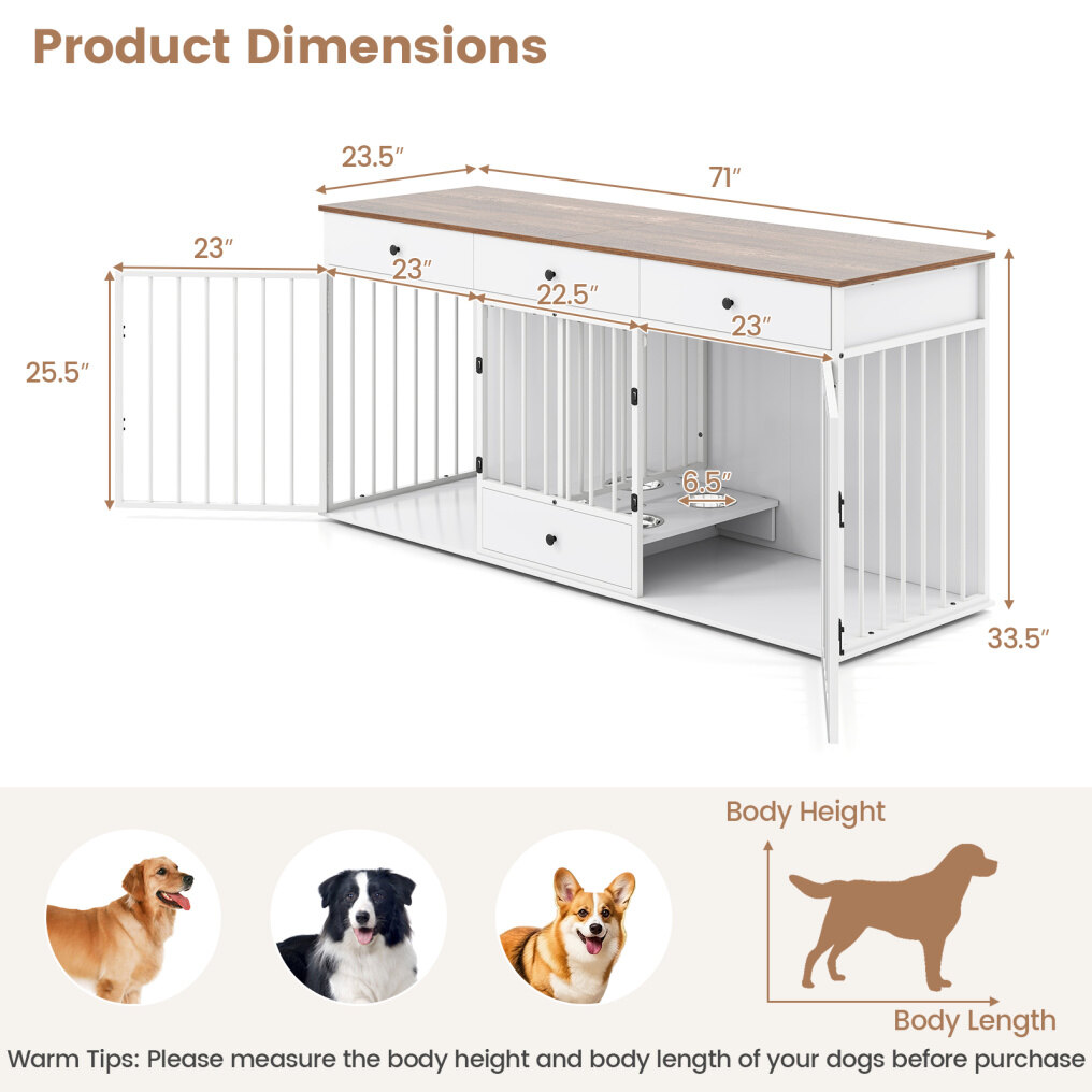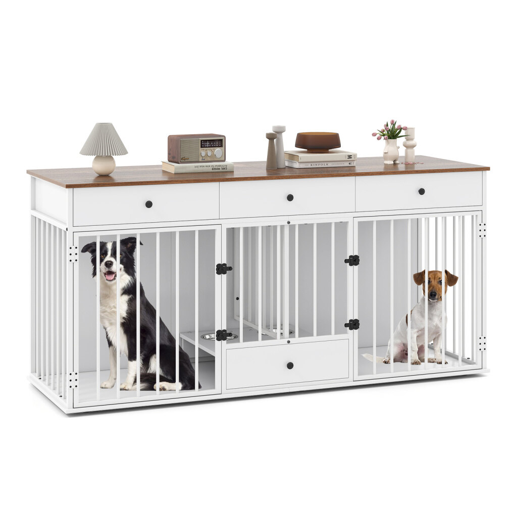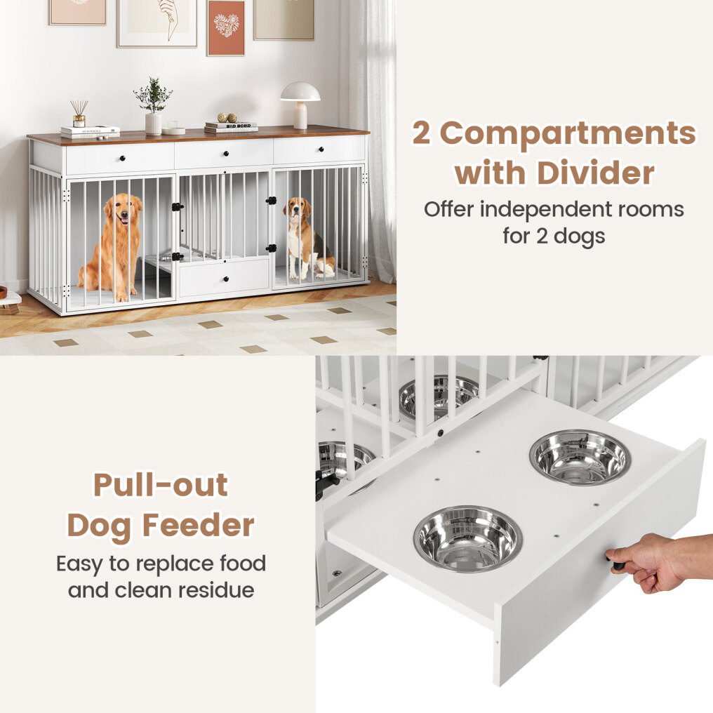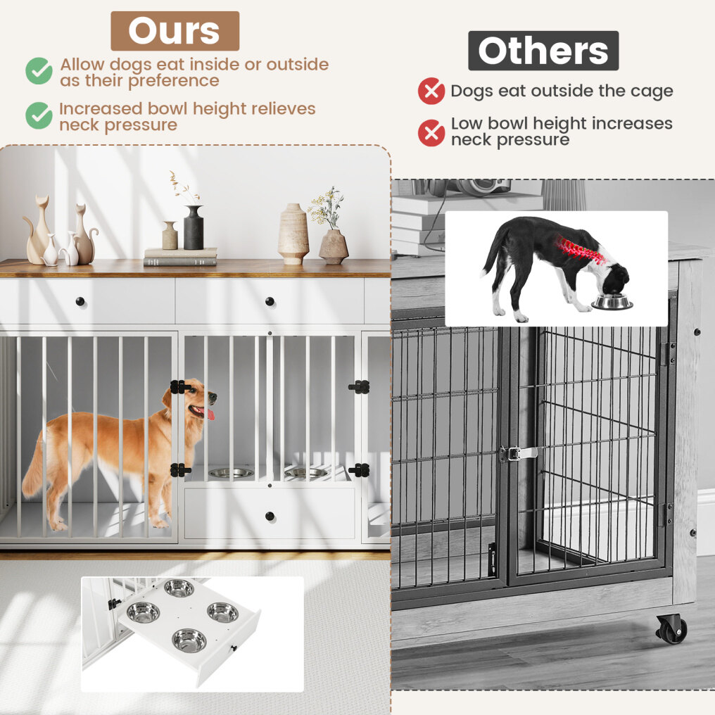 It offers ample storage with 3 big drawers and a wide countertop, allowing you to store books, plants, albums, and dog supplies. Besides, the practical pull-out dog feeder with 4 detachable stainless steel bowls makes feeding convenient and comfortable, reducing neck pressure on dogs, while the lockable doors with sturdy metal latches provide safety and independence for 2 dogs. The smooth countertop surface is easy to clean, and the thickened boards along with the sturdy metal frame ensure stability. Hence, this dog crate kennel is a perfect addition to your home for both functionality and pet care. If you are looking for such a product, do not hesitate to buy it!