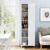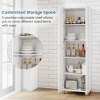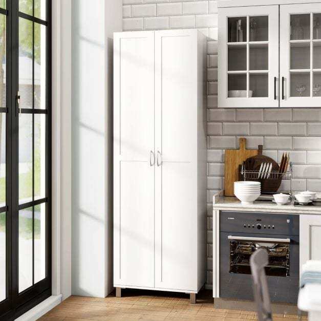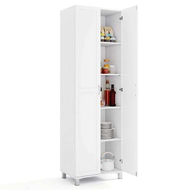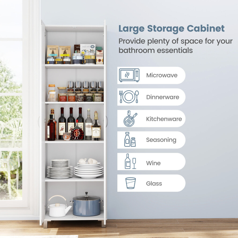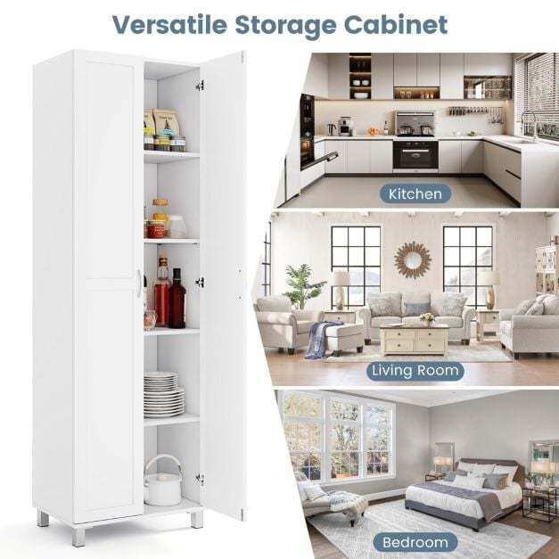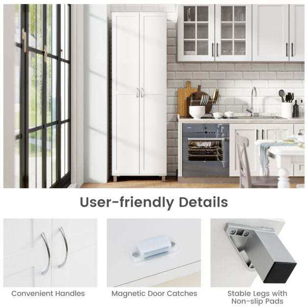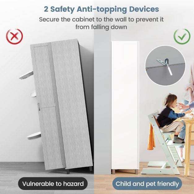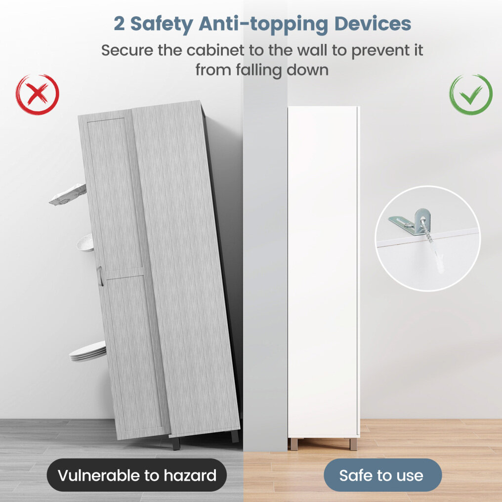 Ultra Stable and Rugged Structure: Made of thick engineered wood and MDF, our floor cabinet shows perfect performance in lasting durability. Besides, equipped with anti-toppling device, the pantry cabinet can be fixed to the wall to prevent wobbling or tipping over. 4 heavy-duty support legs further enhance stability.