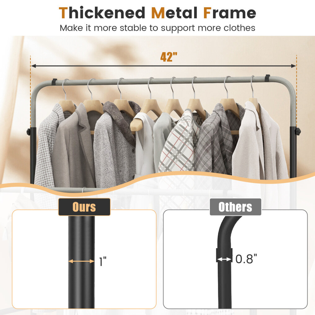 ● Considerate Design: Equipped with adjustable foot pads, this garment rack allows you to fine-tune each corner for a perfectly level setup, providing peace of mind that your garments stay securely in place.