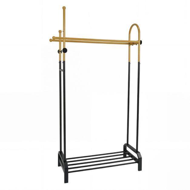 Organize your space efficiently with this versatile coat rack that combines style and functionality. This hanging coat rack features a sturdy metal frame and a reinforced U-shaped base, ensuring stable support for your clothes. Its elegant gold and black color scheme, along with rounded edges, protects your garments from scratches and adds a modern touch. Ample storage options include two bars—one for hanging clothes and the other ideal for scarves or ties—as well as five side hooks and an additional side bar for coats or bags. Furthermore, the lower shelf provides a perfect space for shoes or other items.