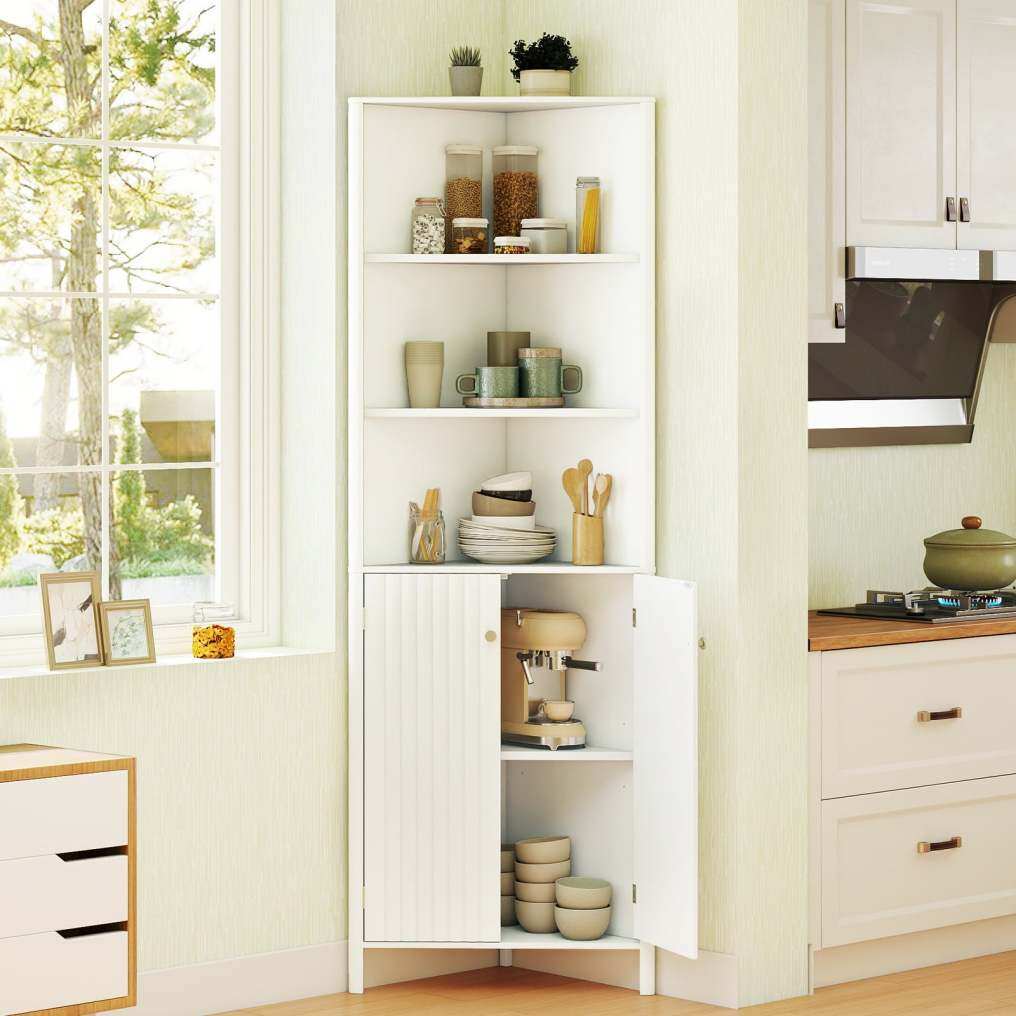 Stylish modern look: With its wave-grooved doors, delicate knobs, and rounded edges, this freestanding corner shelf offers a stylish and elegant appearance. Its versatile aesthetic makes it an attractive addition to bathrooms, living rooms, or kitchens, and it blends harmoniously into various interior design styles.