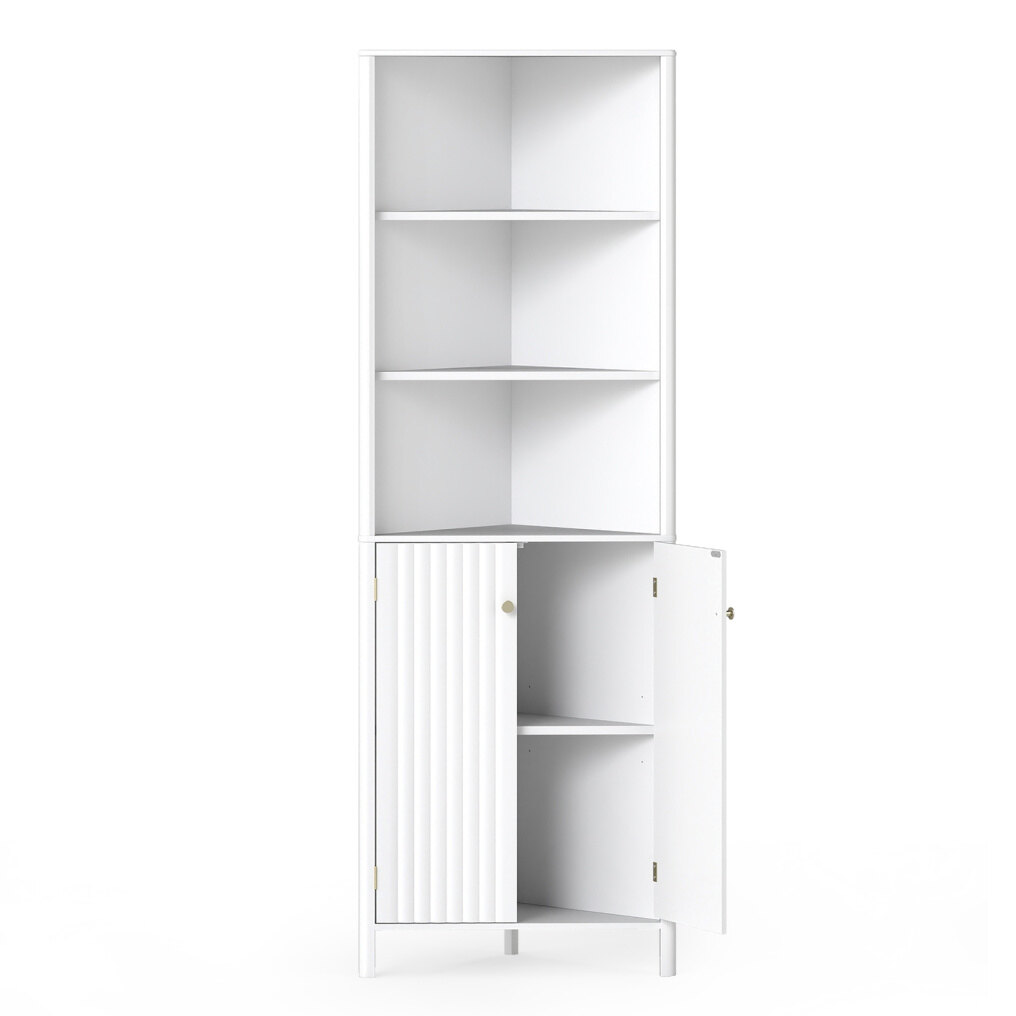 The 90° angled design fits seamlessly into any corner, making it a practical solution for small spaces. The corner storage unit features three open shelves and a spacious two-door cabinet to keep everything neatly organized. The interior offers a customizable solution with a three-level adjustable shelf to accommodate different storage needs. Furthermore, the elegant, wave-grooved doors and rounded edges add a stylish touch, making it a versatile addition to bathrooms, living rooms, or kitchens.
