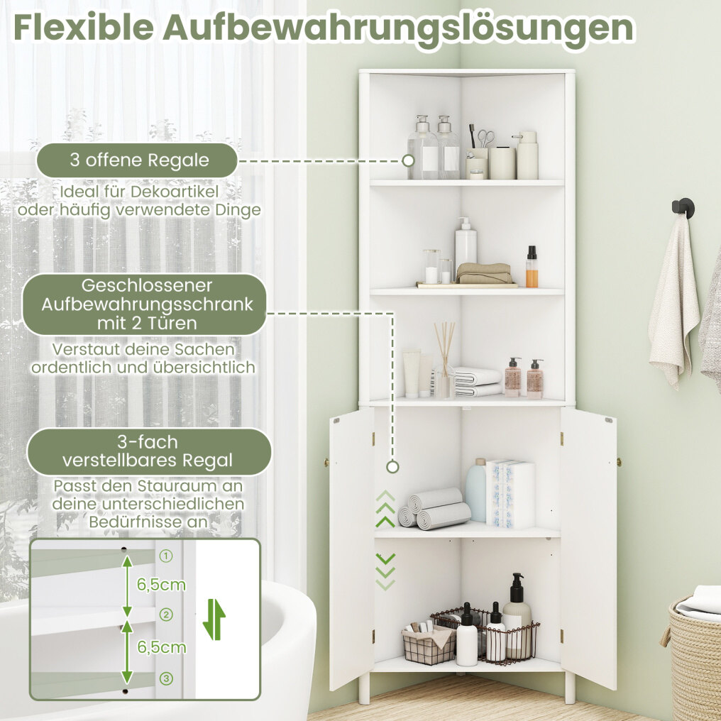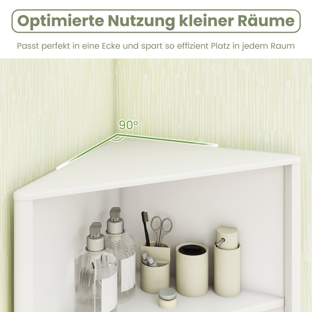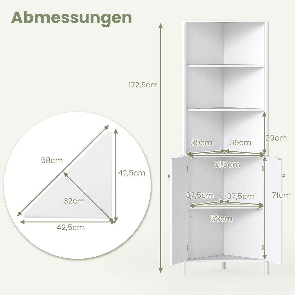 Optimal corner fit: Our tall corner cabinet features a precise 90° angle design that fits perfectly into a corner, effectively saving space in any room. Measuring 32 x 58 x 172.5 cm (D x W x H), the vertical design ensures optimal use of small spaces without sacrificing storage capacity.