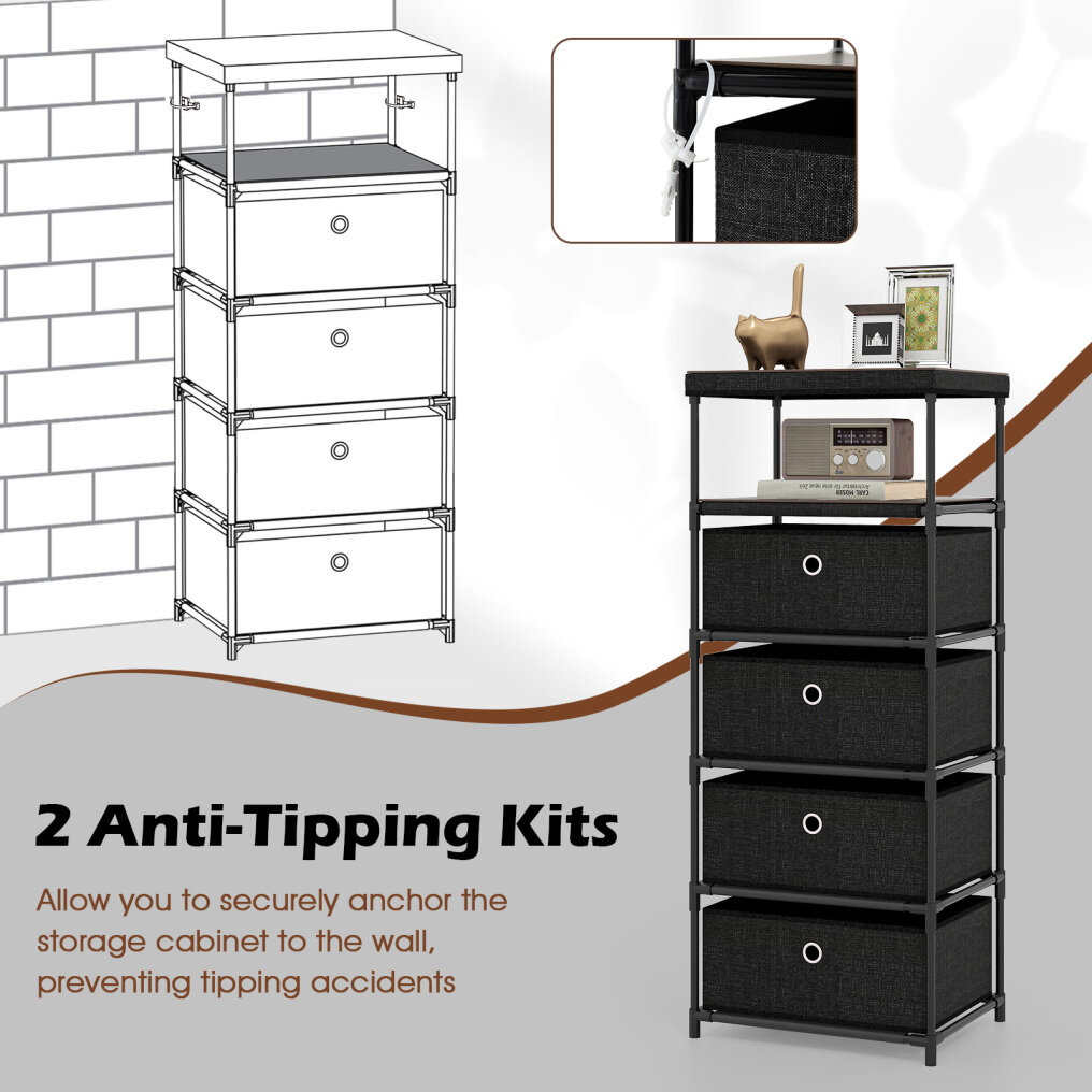 ● Sturdy and Stable Structure: Built with robust metal tubes, the fabric storage cabinet ensures a strong structure that can withstand daily use. Moreover, it comes with dual anti-tipping kits that highly promote overall stability.