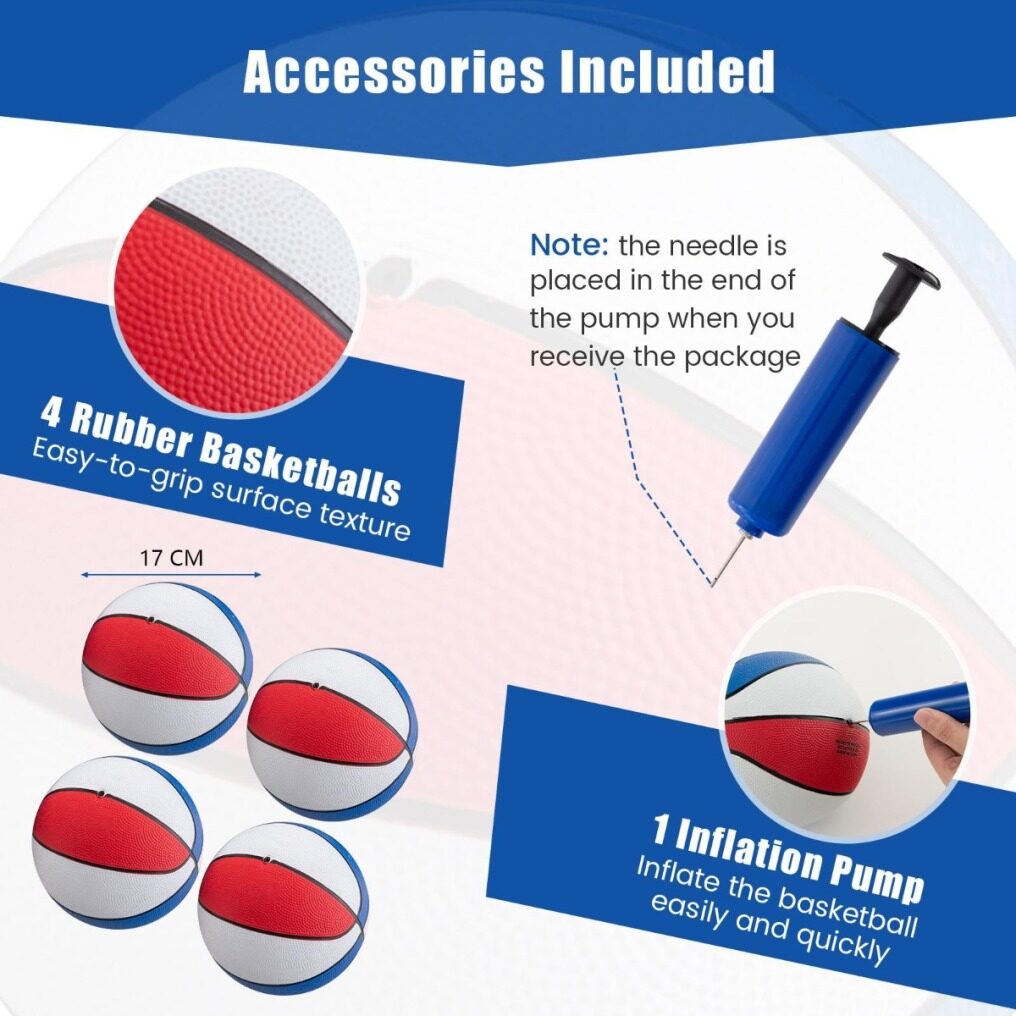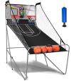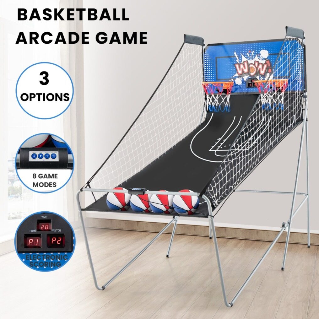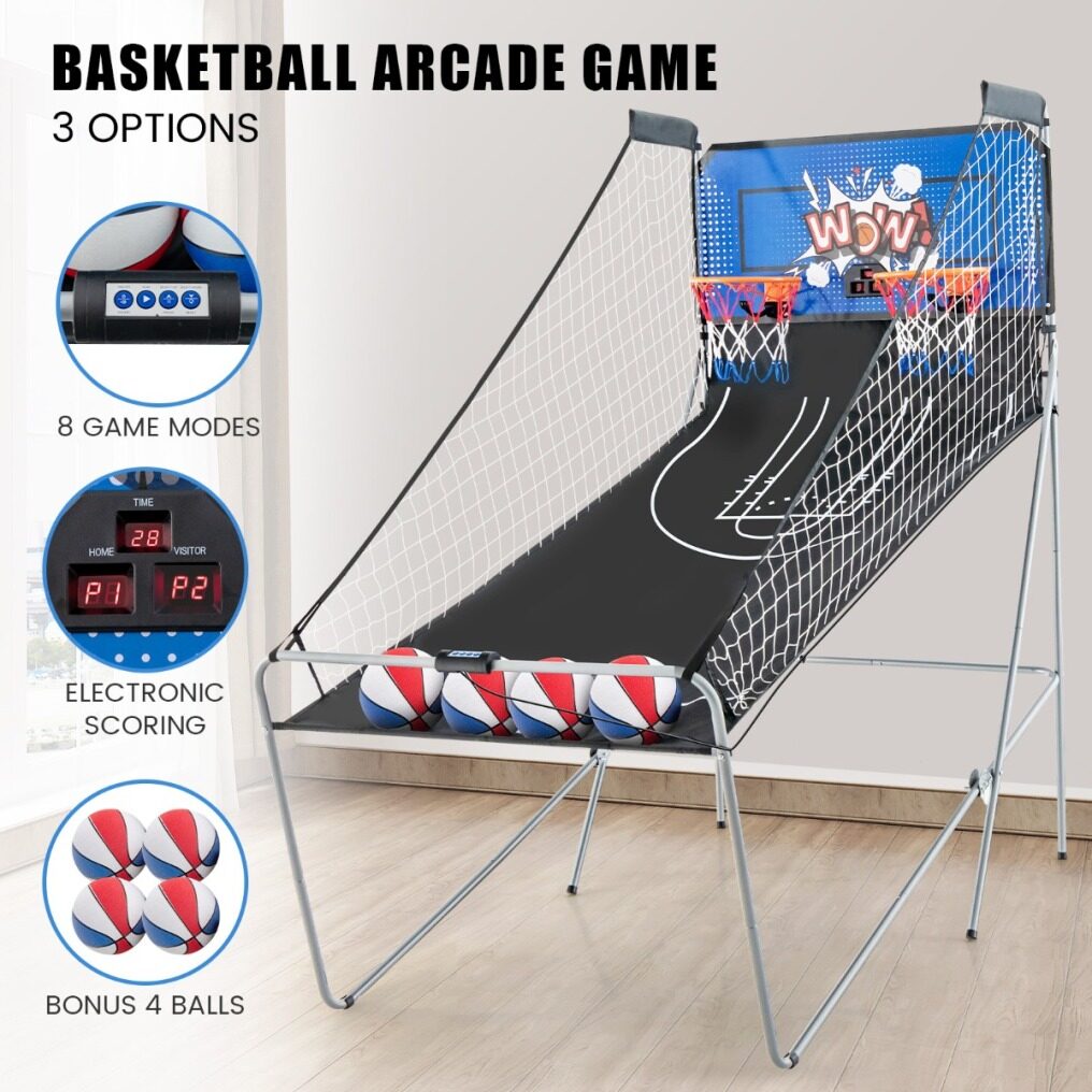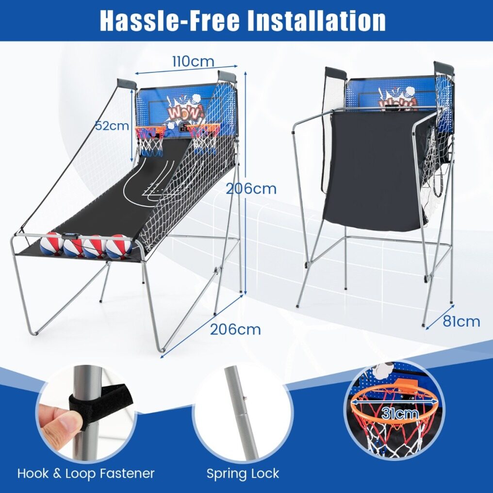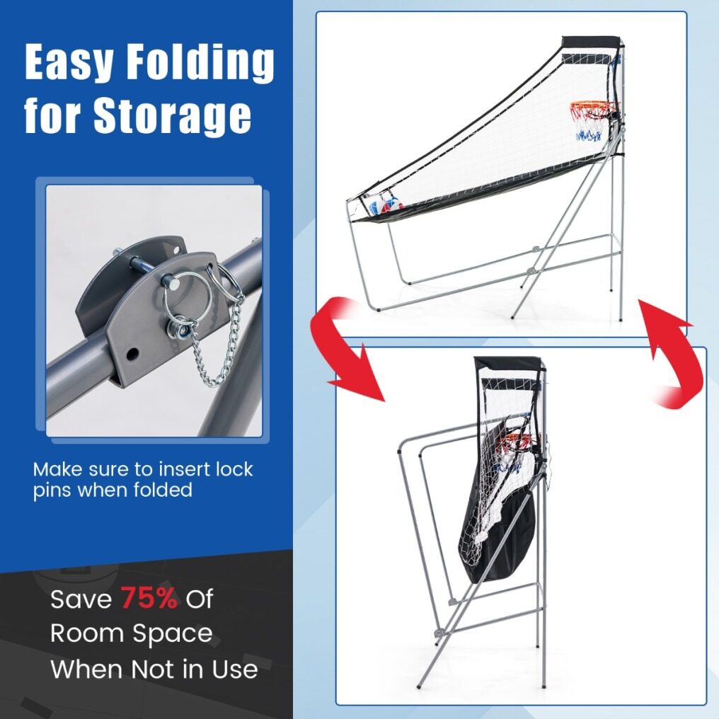 ● Fold up for Easy Storage: Featuring a folding design, this basketball arcade game can fold into a storage position in seconds for space-saving storage, perfect for small spaces or for those who want to maximize their living area. Note: make sure to insert lock pins when folded.