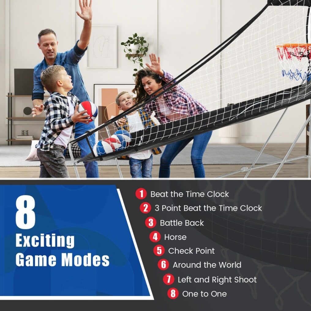● Fun for All Ages: This folding dual shot basketball arcade game is the perfect addition to any game room, basement, or backyard. It is suitable for 1-4 players and has 8 game modes with sound effect: beat the time clock, 3-point beat the time clock, battle back, horse, check point, around the world, left and right shoot and one to one.