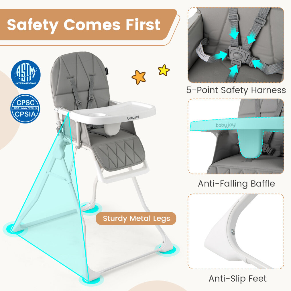 ● Safety Comes First: This ASTM and CPSIA compliant baby feeding chair is made with BPA-free PP food tray and sturdy metal legs. Plus, 5-point safety harness, anti-falling baffle and anti-slip feet add extra security.