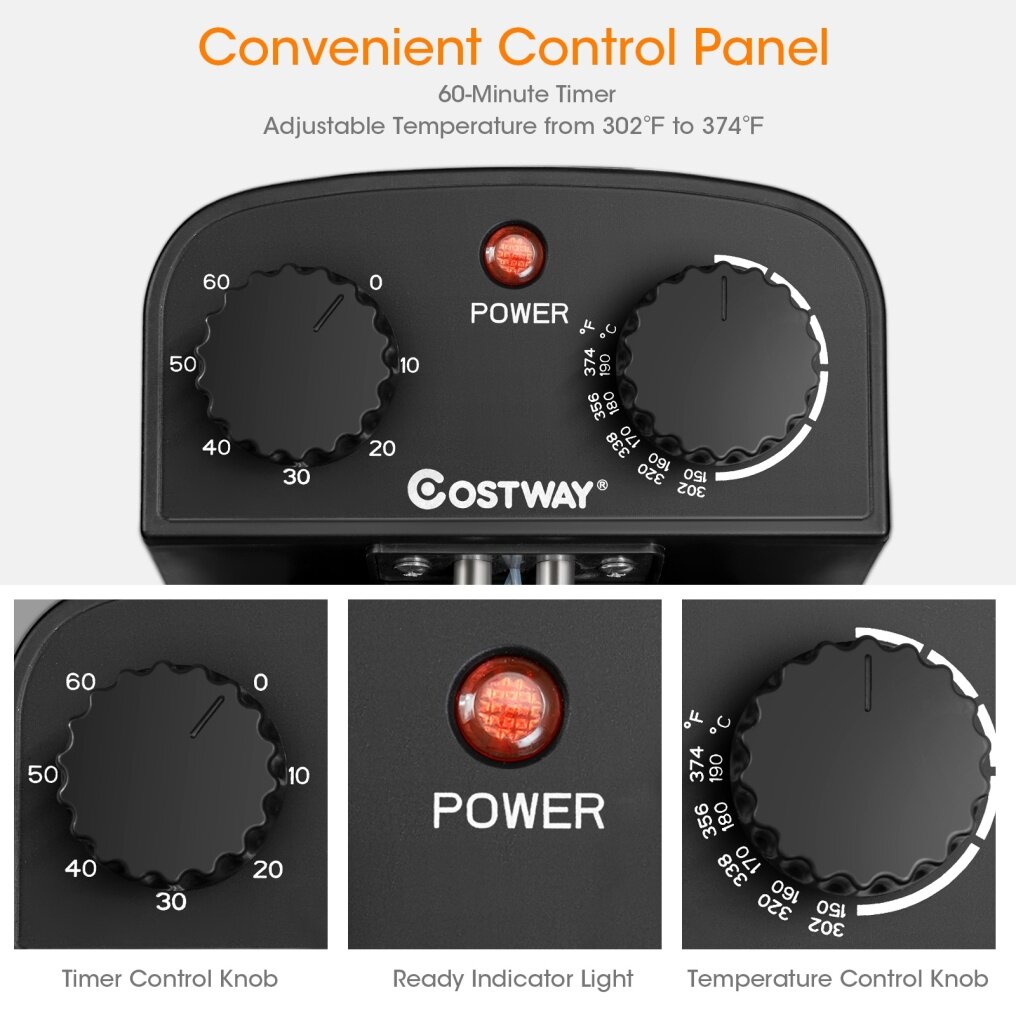 -Equipped with temperature control knob (from 302 to 374 degree Fahrenheit) and 60-minute timer to meet your different needs