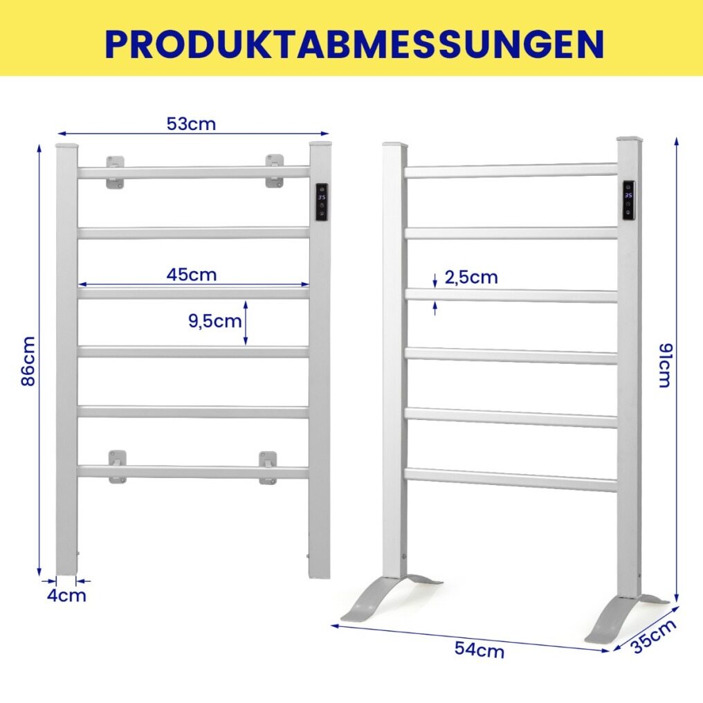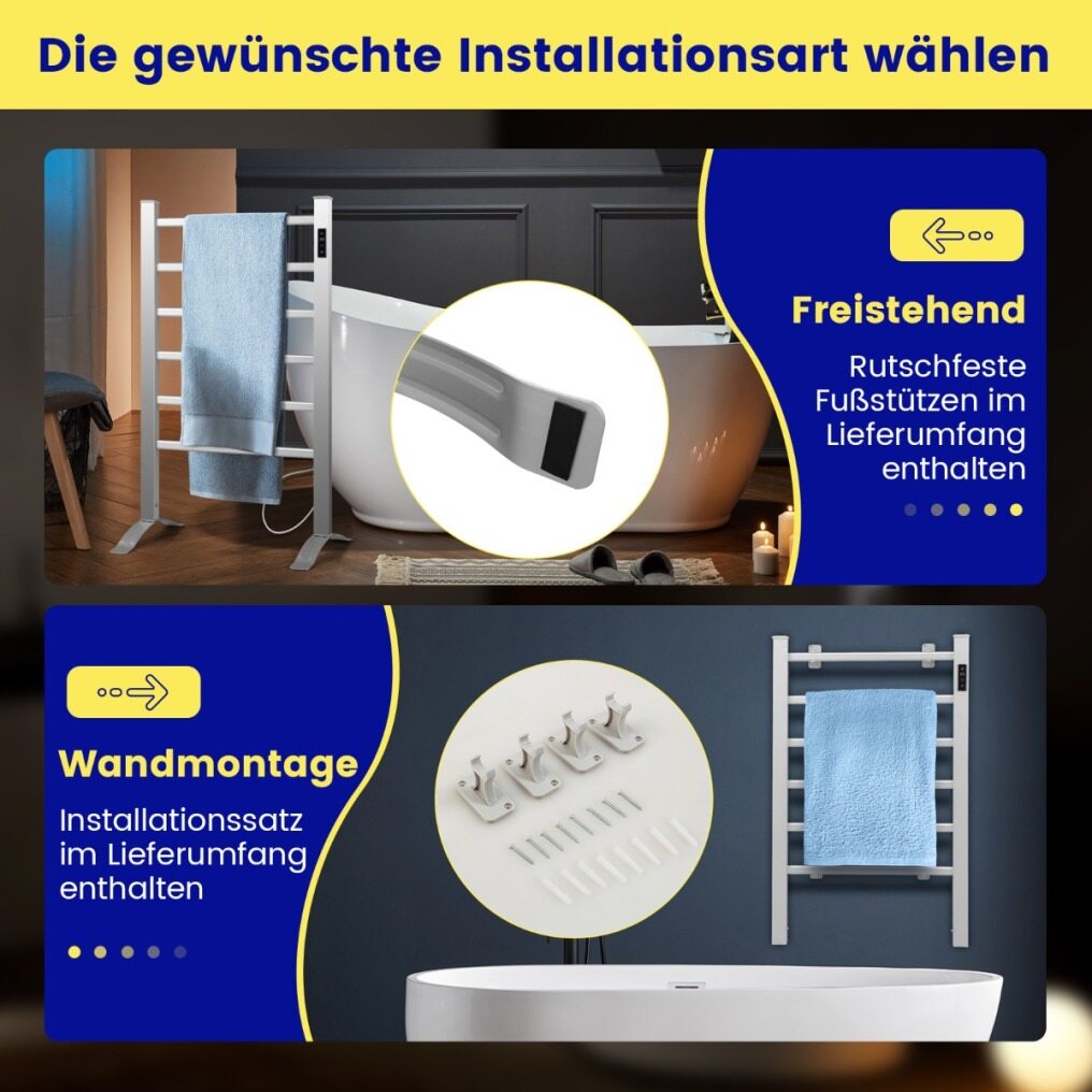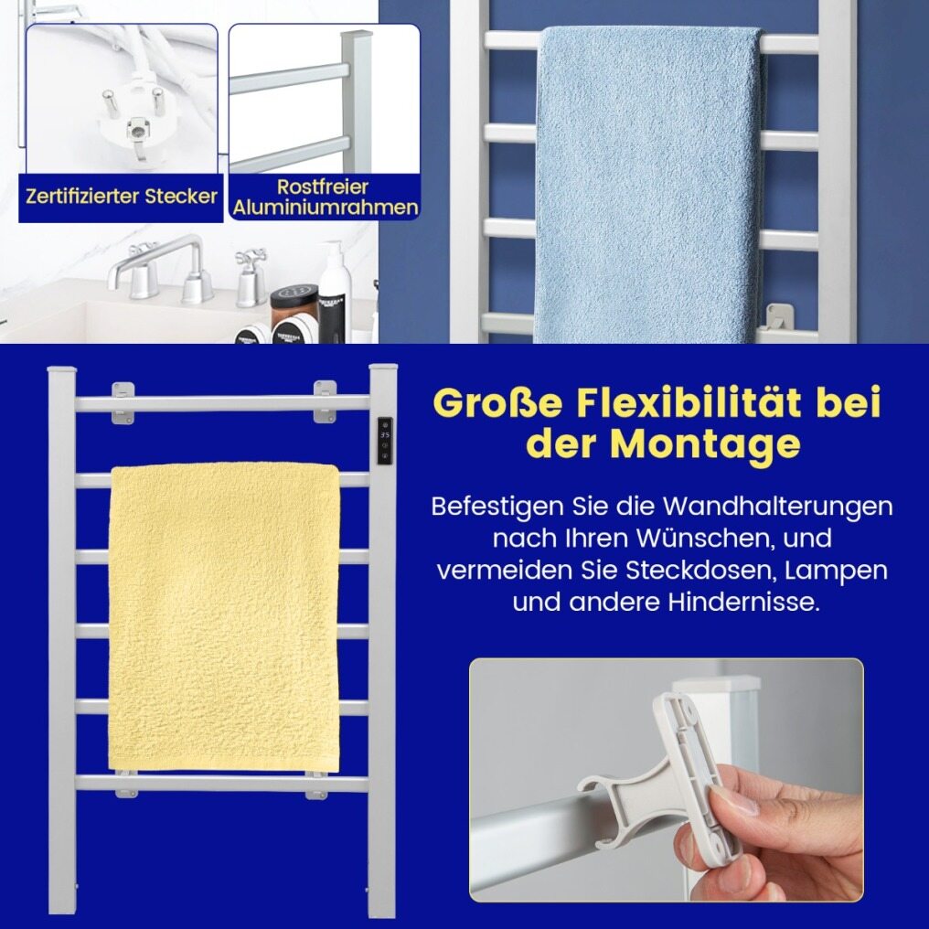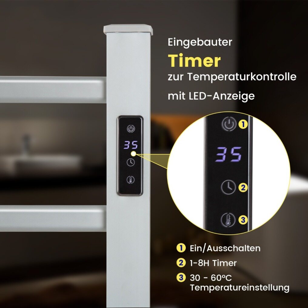 This heated towel rail can be wall mounted or placed on the floor. The scope of delivery includes mounting equipment and accessories. In addition, wall mounting offers great flexibility. You can attach the wall mount brackets according to your preferences, avoiding outlets, lights and other obstacles for your convenience. The temperature heats up quickly and stays constant once the set temperature is reached. In addition, the timer of 1-8 hours allows an individual time setting. The rust-proof and waterproof aluminum frame is durable for long-term use.