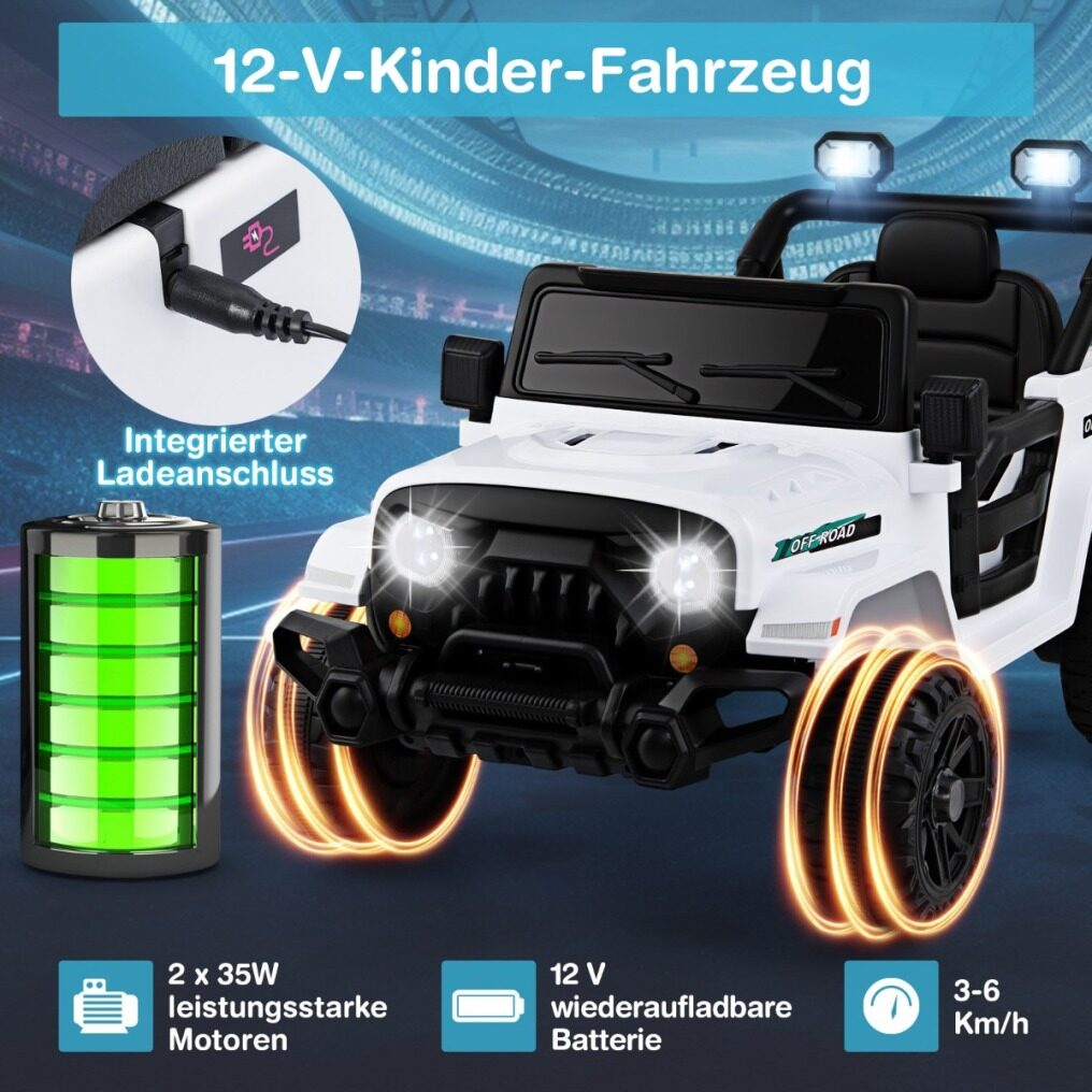 Equipped with two powerful 35W motors, this ride-on car for kids offers endless fun with a rechargeable 12V battery for extended playtime. Children can drive independently with the user-friendly steering wheel and foot pedals, or parents can take control with the remote control with 3 adjustable speeds. The all-terrain wheels offer the freedom to explore different surfaces, from asphalt to grassland, for unlimited adventures. The slow start function promises smooth acceleration, while the built-in music, sounds, and wireless connectivity enhance the entertainment features for toddlers. Bright LED lights add extra excitement to the ride. Made from BPA-free materials, this electric ride-on toy features adjustable seat belts and lockable doors to ensure durability and safety for children ages 3 and up.