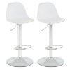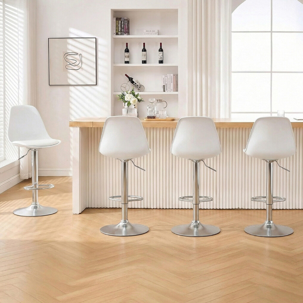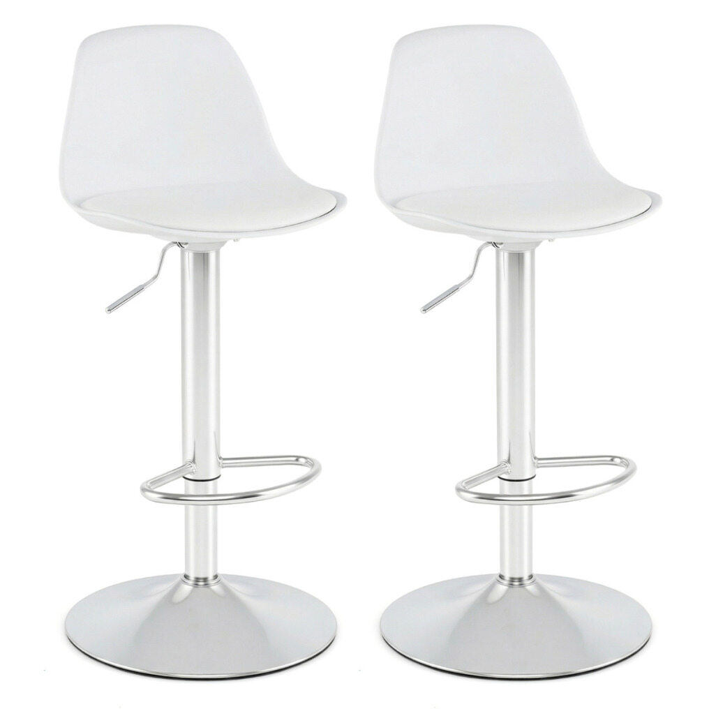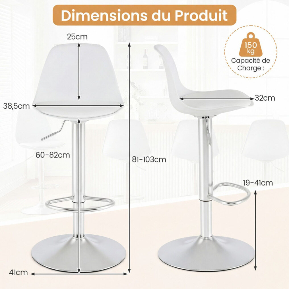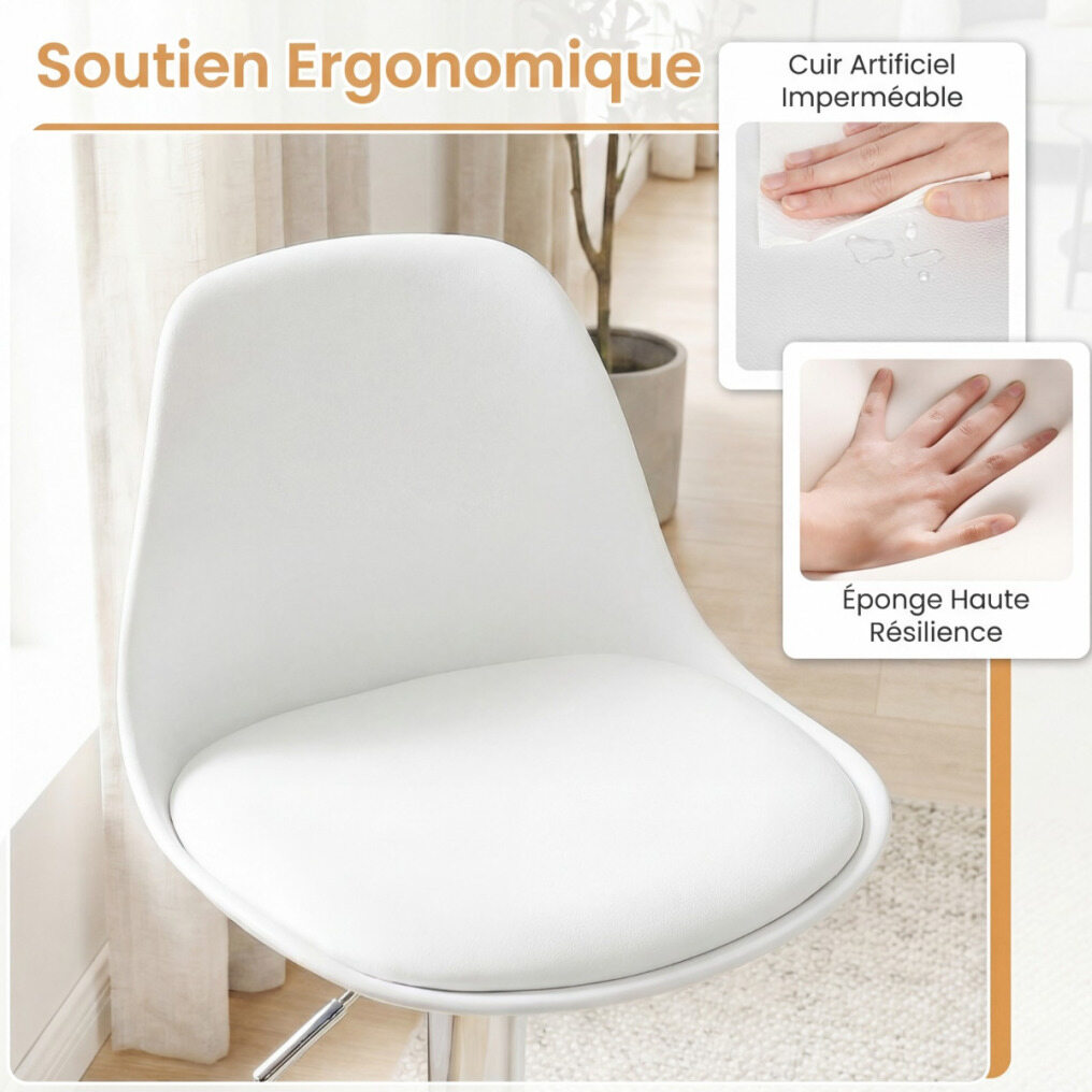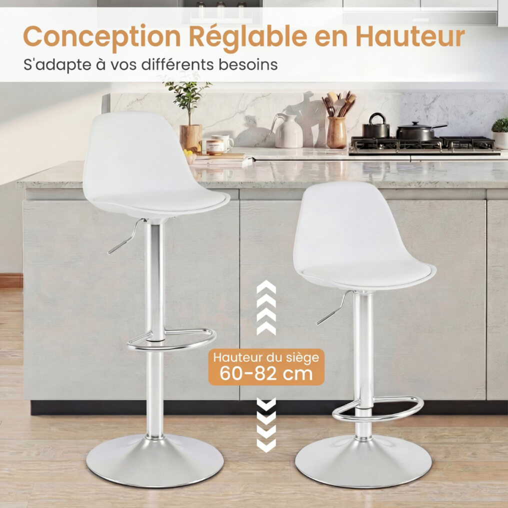 Elevate your comfort with our set of two bar stools! Upholstered in faux leather and padded with foam, these counter stools feature backrests and footrests for lasting comfort. Thanks to a smooth gas lift, the seat height easily adjusts from 60 to 82 cm, adapting to various counter and bar heights. Furthermore, the 360° swivel allows for effortless movement, encouraging friendly interaction. Featuring chrome-plated metal frames with round bases and non-slip feet, these stools offer enhanced stability while protecting your floors from scratches. Combining comfort and versatility, these modern stools are ideal for kitchens, home bars, or dining rooms.