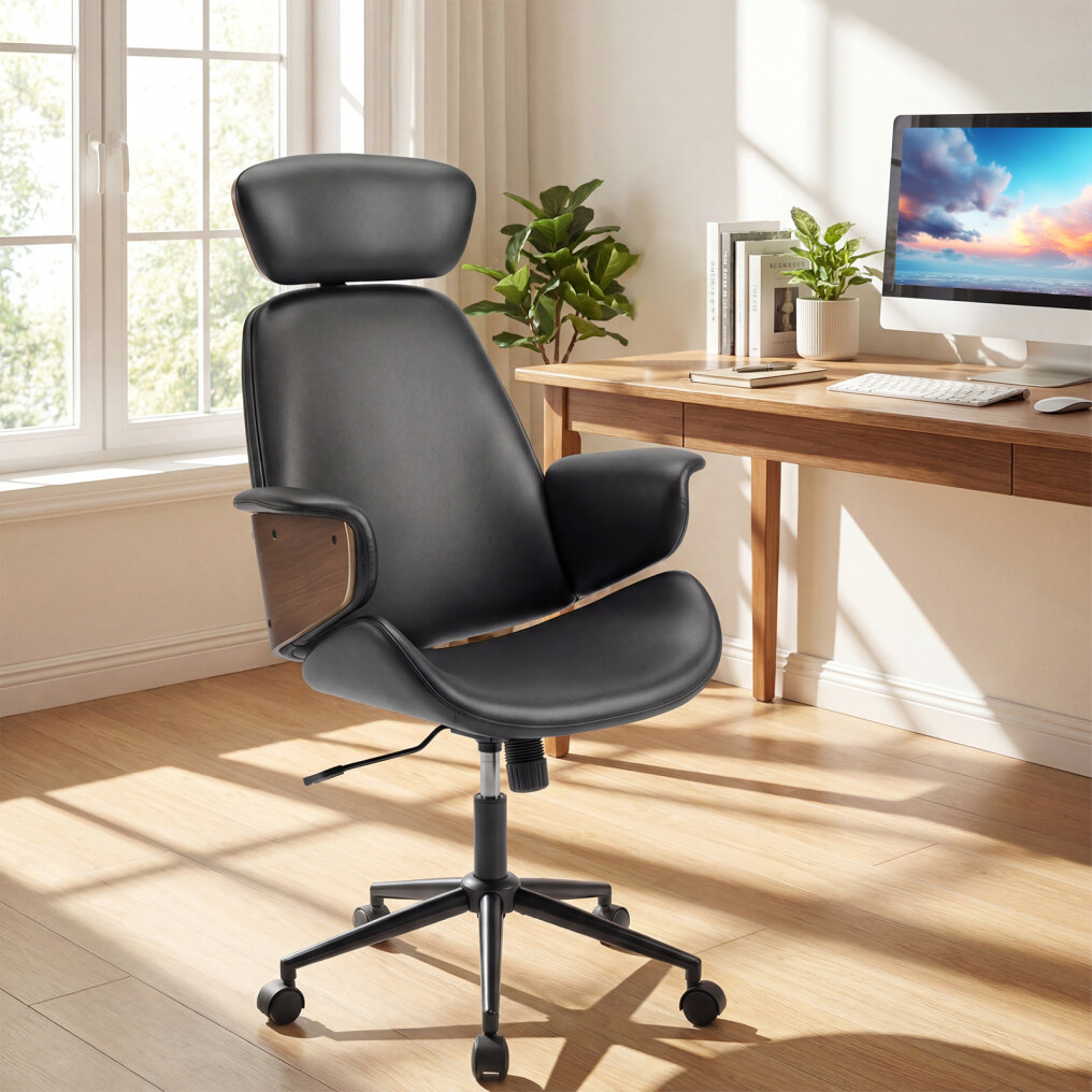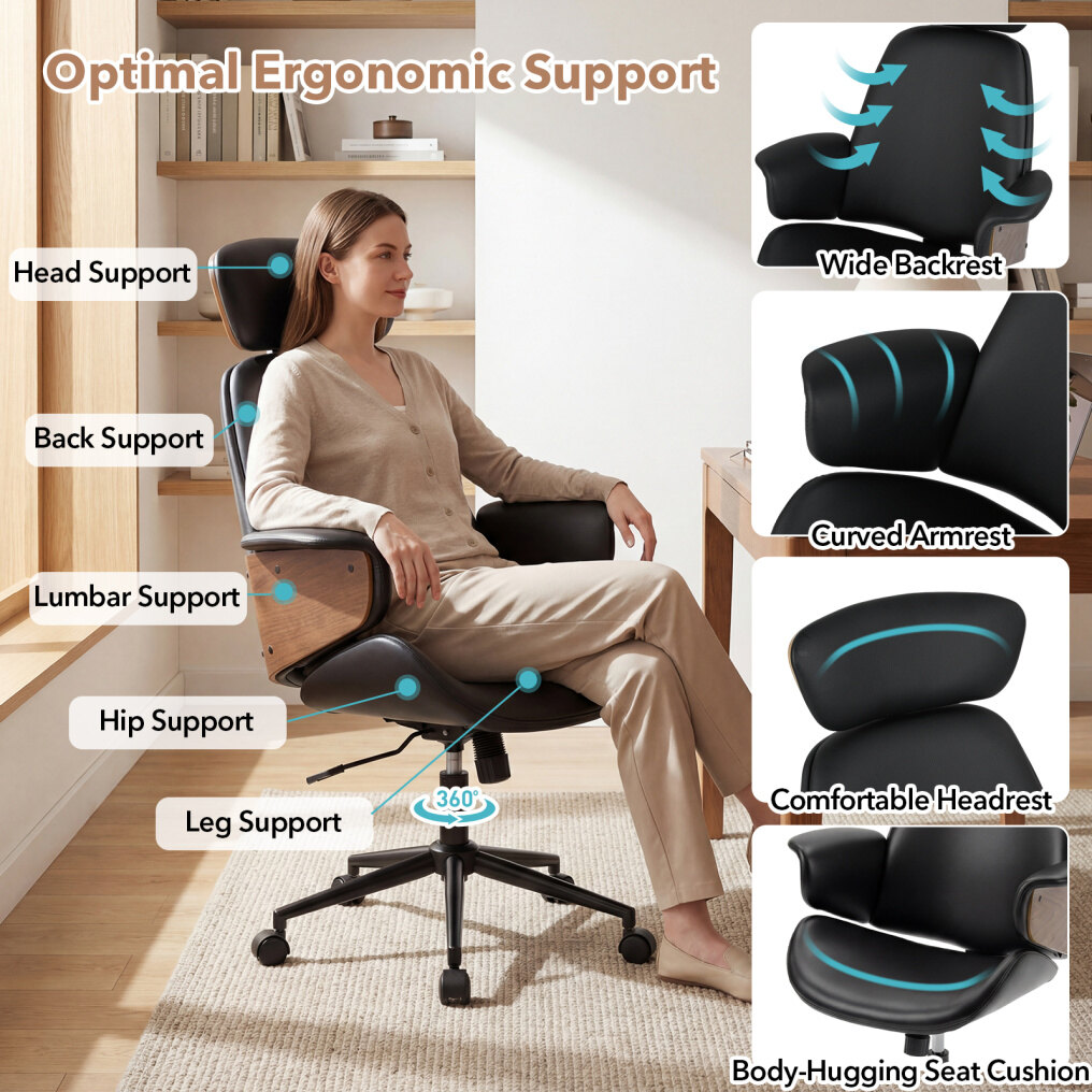 ● Elegant & Comfy Office Chair: Designed with a wood-like surface and selected faux leather, this swivel desk chair offers modern charm and easy care. Body-hugging cushion, curved armrest and sleek silhouette make it a perfect mid century accent chair for enhancing the workspace with visual appeal while keeping comfort all day.