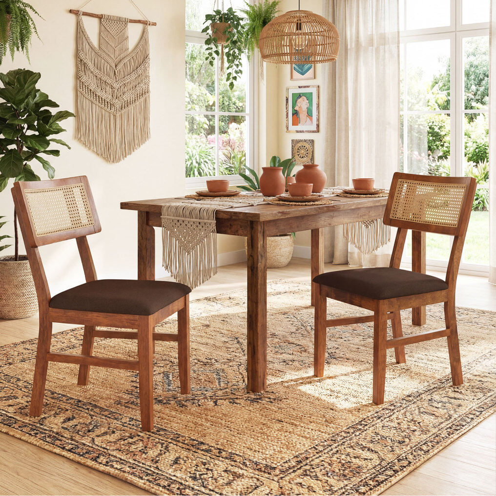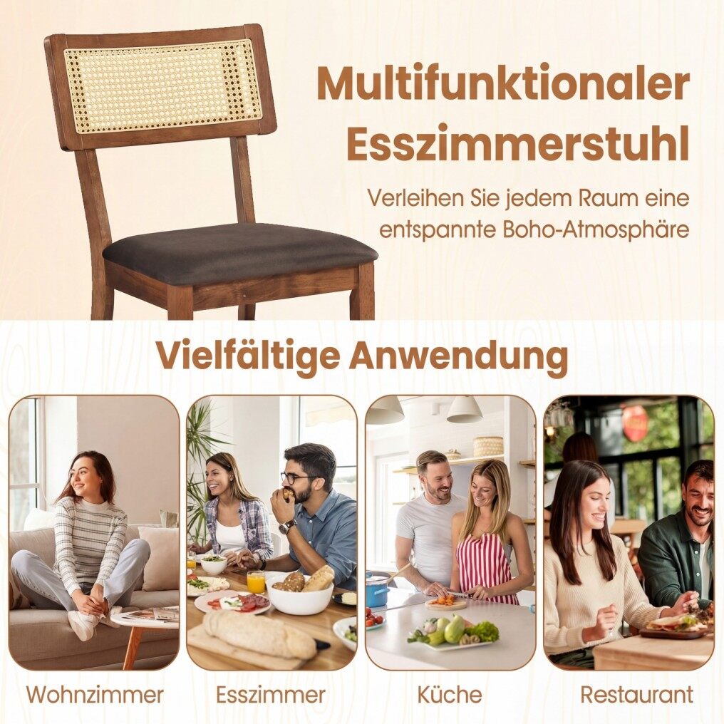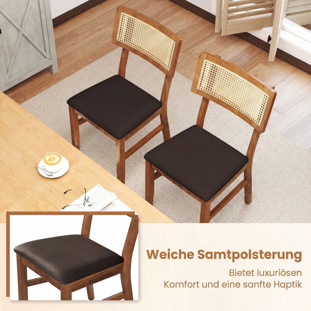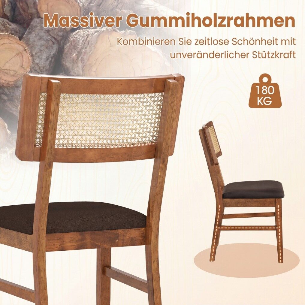 Bring natural beauty and comfort to your dining area with these rubberwood chairs! The handwoven rattan backrest adds boho charm to each chair and creates visual warmth in any room. The sturdy solid wood frame supports up to 180 kg, while the soft velvet upholstery and high-density foam filling provide exceptional comfort for every meal. With breathable, ergonomic backrests, these accent chairs offer excellent support, even during long meals and gatherings.