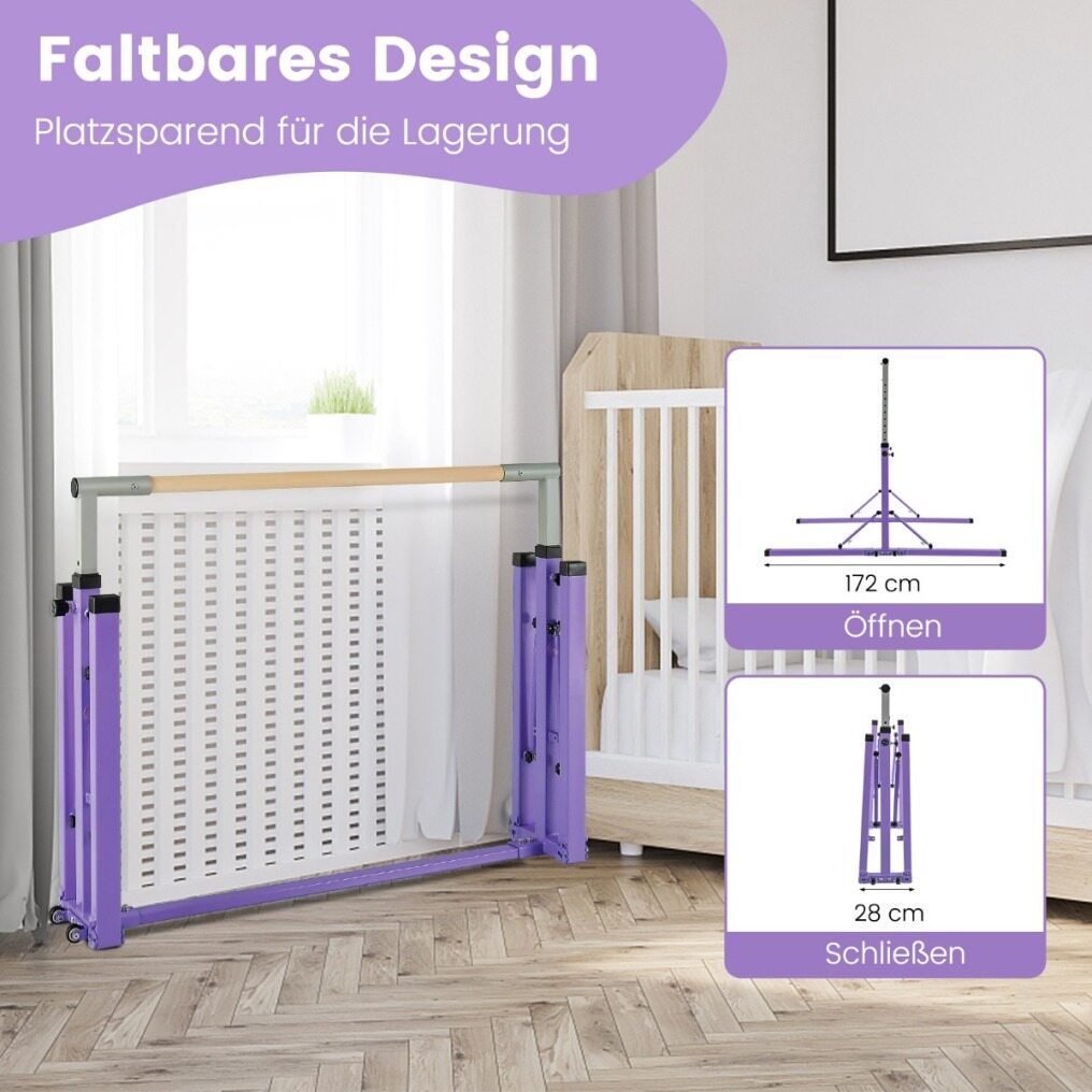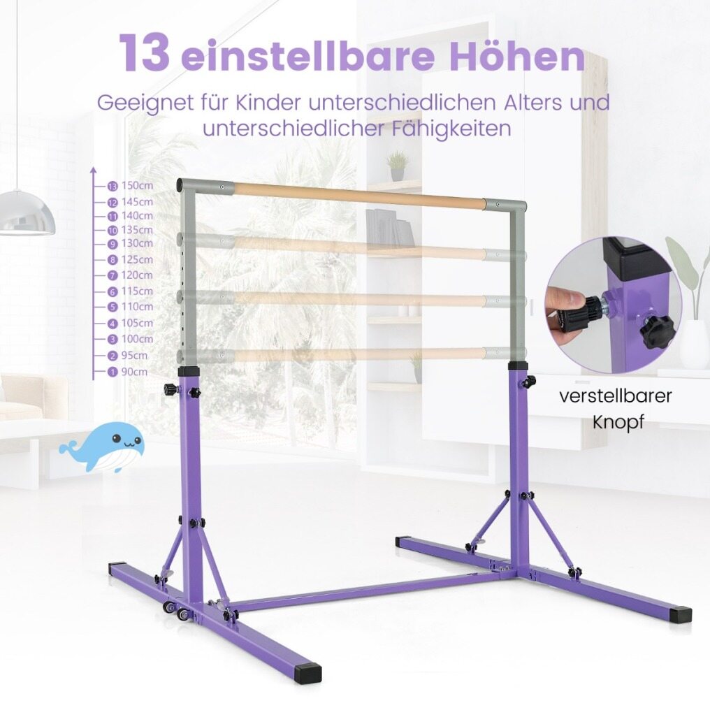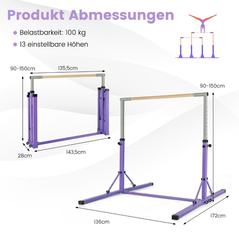 Easily foldable for space-saving storage: The foldable design significantly reduces the size of the gymnastic bar, saving space when not in use. It also features smooth-rolling wheels, allowing your children to practice gymnastics anywhere.