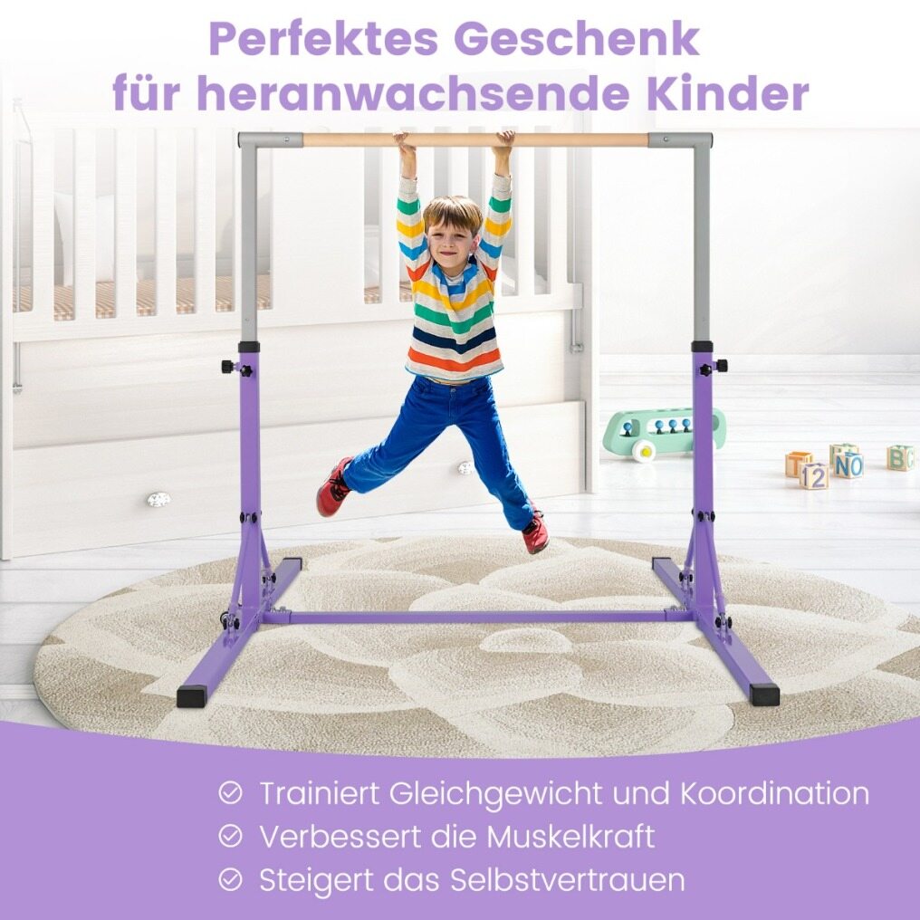 User-friendly details: Equipped with non-slip feet to prevent tipping or slipping, this gymnastic bar increases the child's safety during use. Additionally, the double knob locks the bar's height in two different directions for added stability.