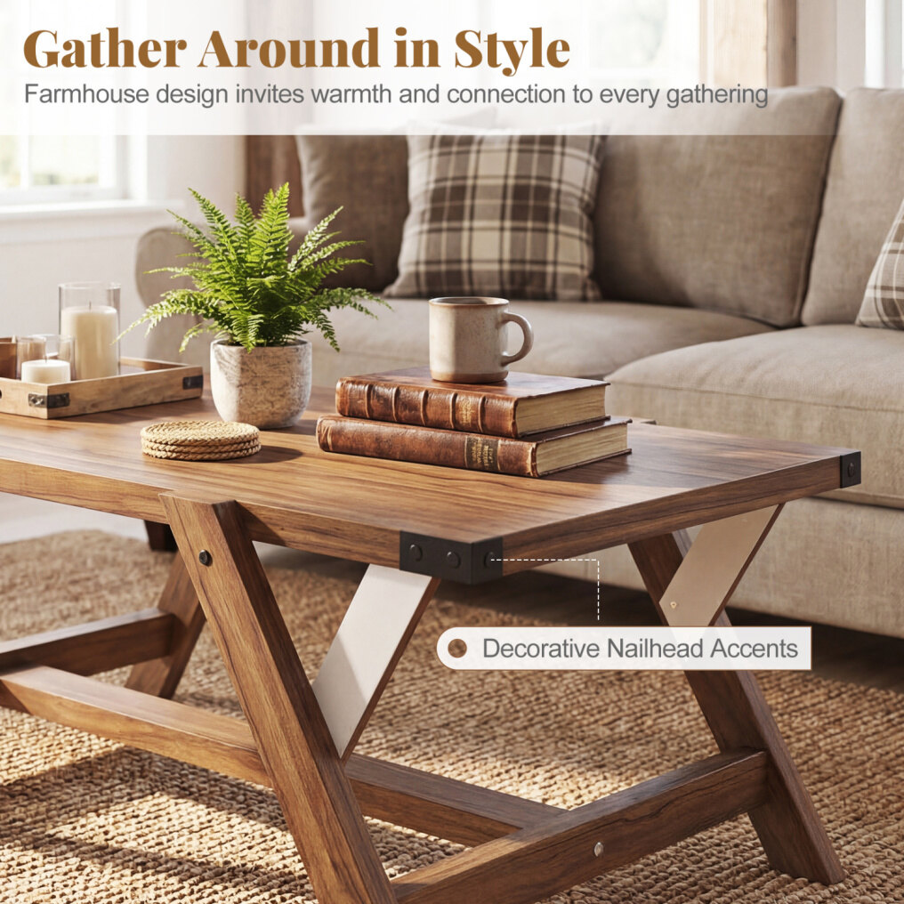 ● Farmhouse Charm: Bring cozy character to your living room with a farmhouse coffee table. Decorative nailhead accents add a crafted, rustic touch that elevates the look without feeling heavy, making it easy to pair with modern or traditional decorations.
