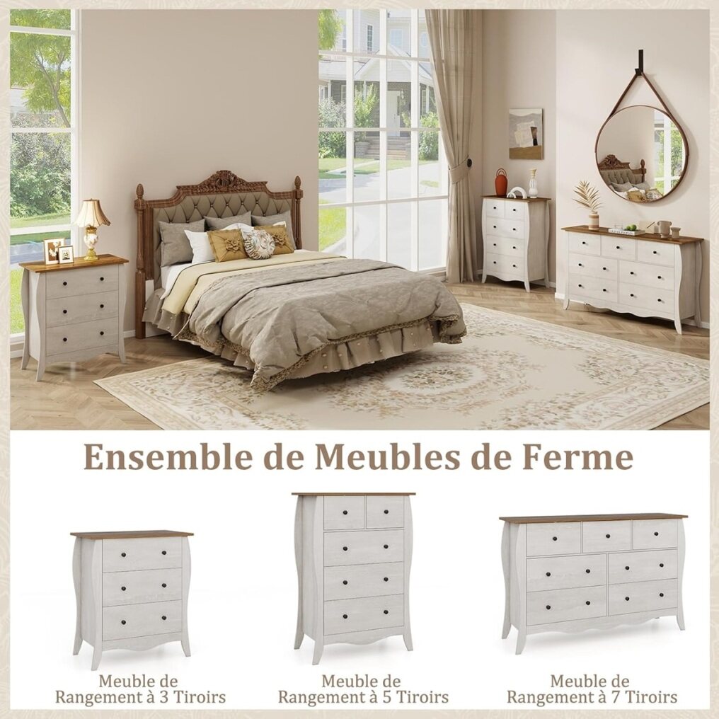 Warmth of Farmhouse Elegance: The 3-drawer dresser boasts a curved silhouette and a wood grain finish for a cozy charm. It is a statement that brings the timeless appeal of farmhouse style into your home, making every room feel welcoming and lived-in.