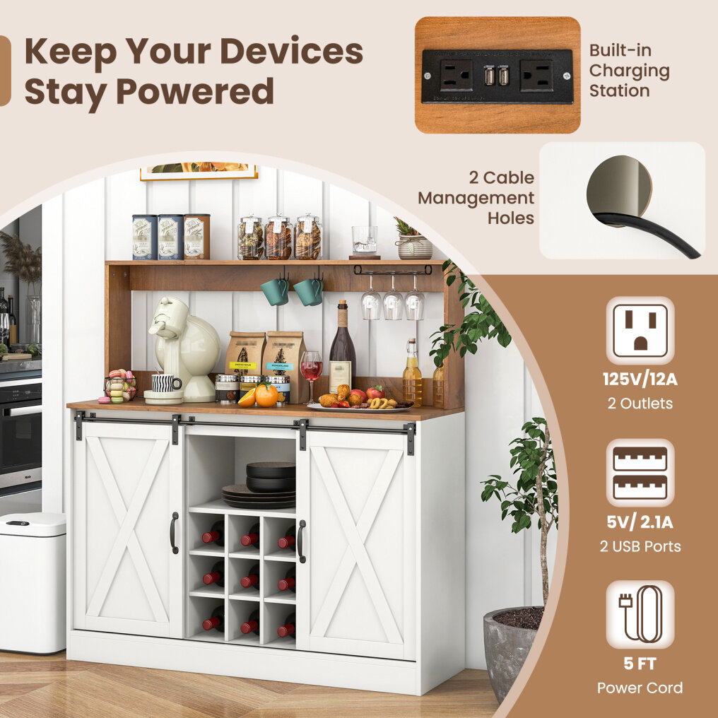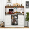 Farmhouse Coffee Bar Cabinet with Charging Station and Sliding Barn Doors-White