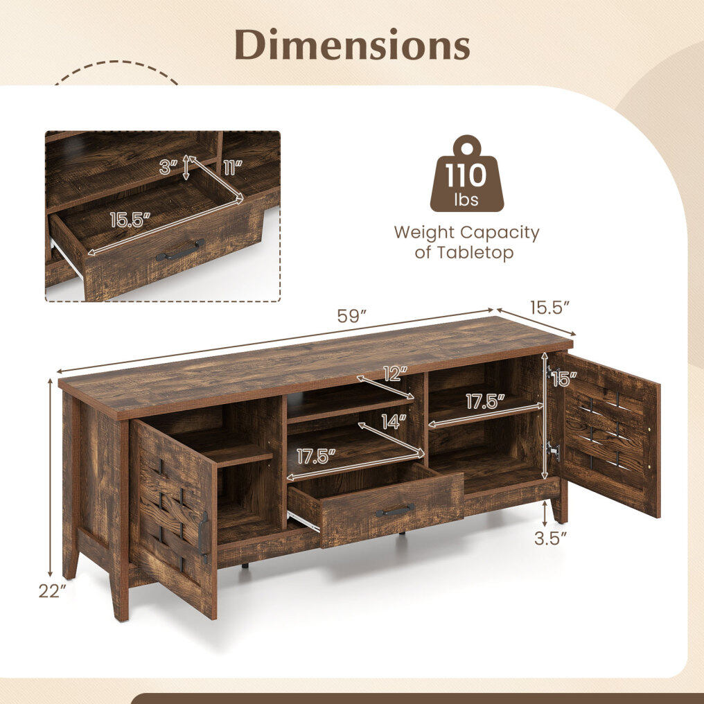 ● All-in-One Entertainment Hub: This TV console features a 59" spacious tabletop that accommodates TVs up to 65 inches, complete with 2 open shelves, a smooth-gliding storage drawer, and 2 side cabinets to organize game consoles and media collections. 2 built-in cable holes keep wires neatly tucked away for a clutter-free look, making this 59" entertainment center perfect for modern living spaces.