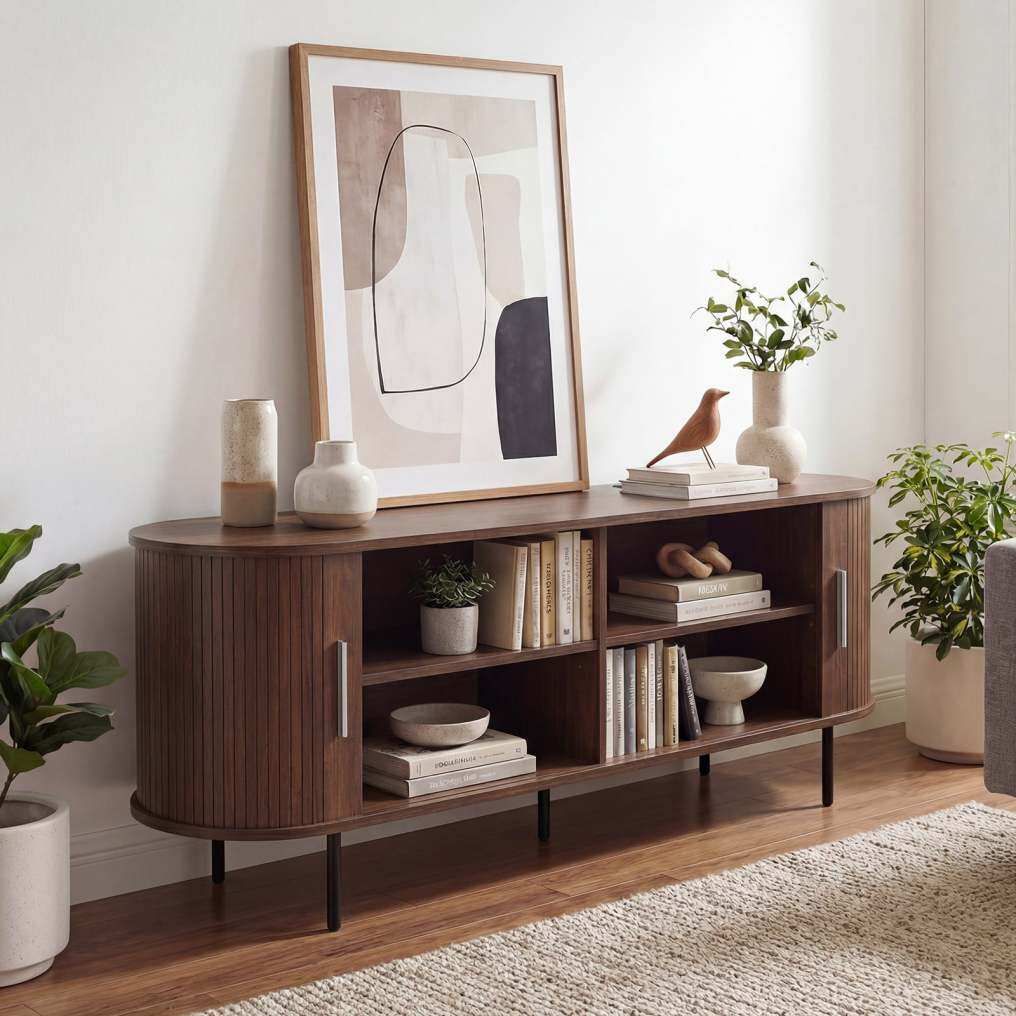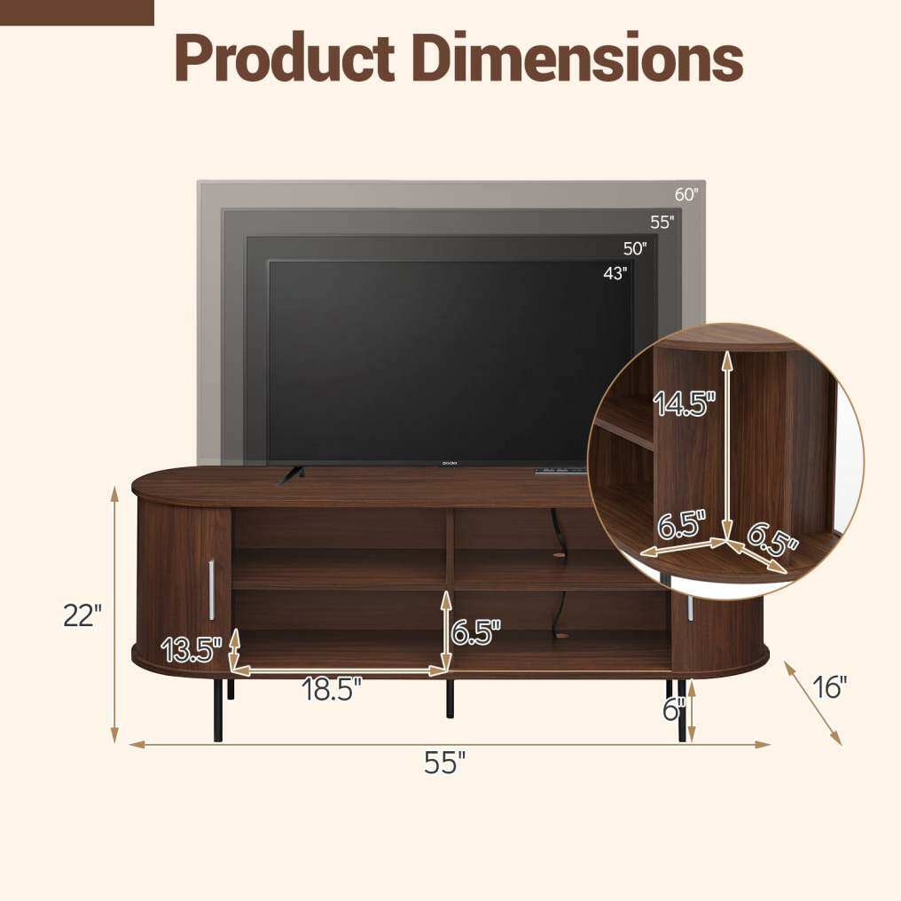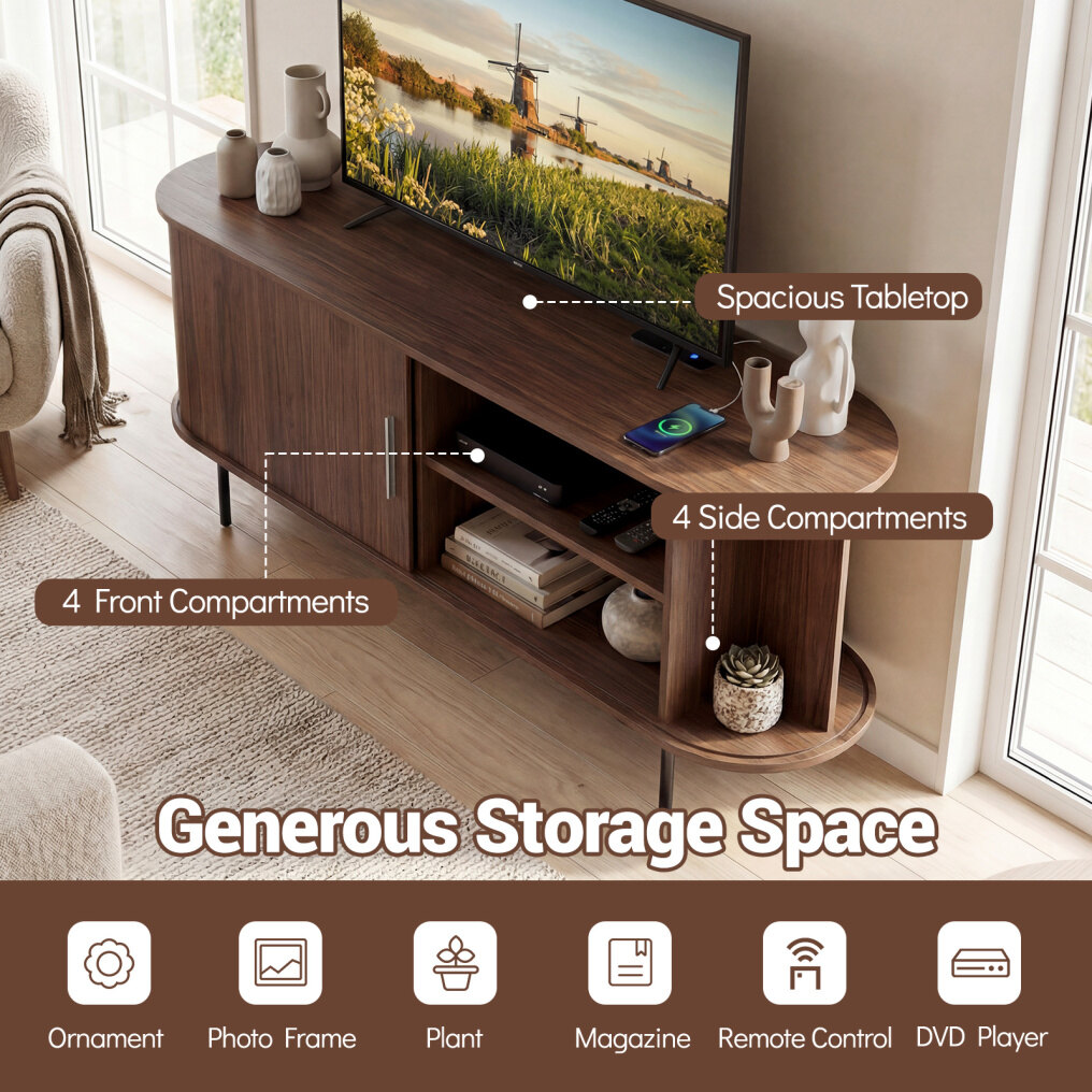 ● Multipurpose TV Cabinet: Thoughtfully crafted to serve as either a TV stand, entertainment center or display cabinet, this piece boasts a modern mid-century design that complements various decorations. Its elegant wood-like surfaces and rounded edges enhance the aesthetic appeal while supplying safety.