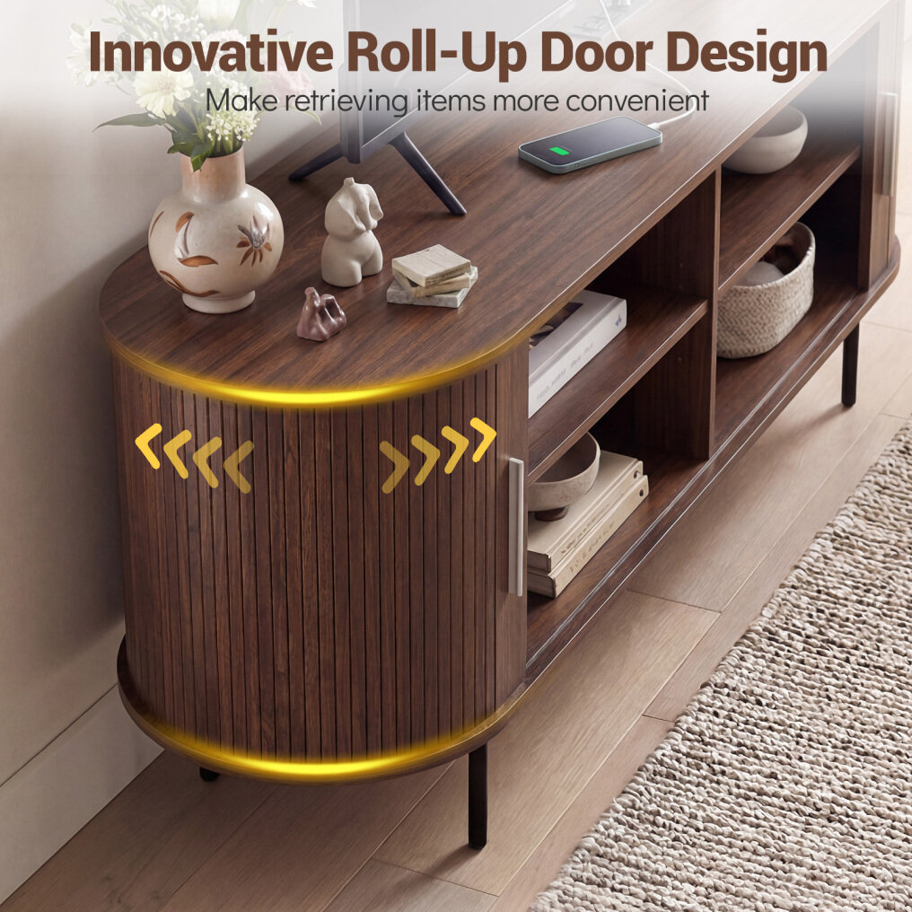 ● Generous Storage Space: This entertainment center offers generous space with 4 front and 4 side compartments hidden behind sliding doors. The innovative roll-up doors with convenient handles, allows for easy access to items such as magazines, DVDs or accessories, keeping your living area tidy.