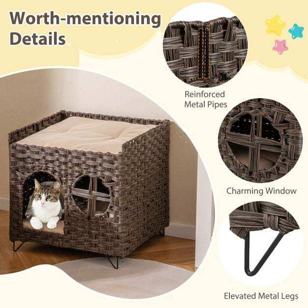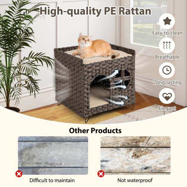 Easy Maintenance: The cushions are washable, making it a breeze to keep your pet's sanctuary clean. Additionally, the selected PE rattan is waterproof, allowing you to maintain the 2-tier nest in pristine appearance with minimal effort.