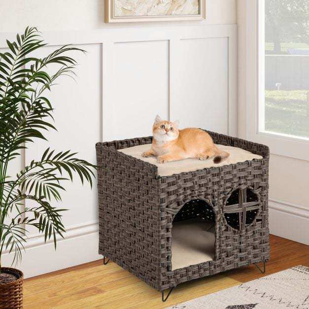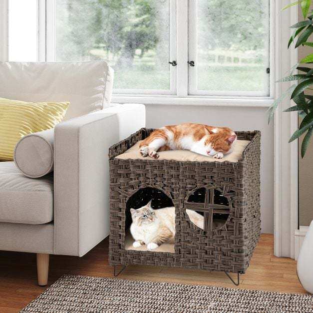 Suitable for All Season: With breathable PE rattan construction, the pet house will create a cooler lounging experience during hot days. Moreover, the 2 sponge filled cushions allow your cats to lounge in warmth and comfort. Also, the cushion can be removed for extra cool.