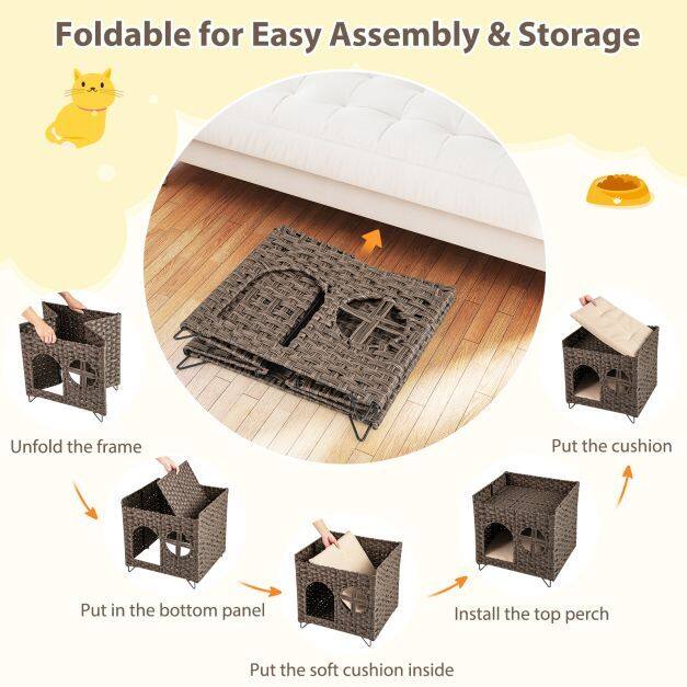 Thanks to a folding structure, the wicker pet condo can be quickly set up. The sturdy rattan material ensures durability, making it a long-lasting investment in your cat's comfort. Cats will love lounging in the spacious condo, which is equipped with a padded cushion. Additionally, the arched doorway offers a sense of adventure and playfulness for kittens. Also, the large perch with raised edges provides a panoramic view of their surroundings. The removable cushions are washable, making cleaning a breeze. Furthermore, the elevated legs keep cats off the floor, while promoting airflow.