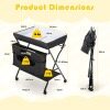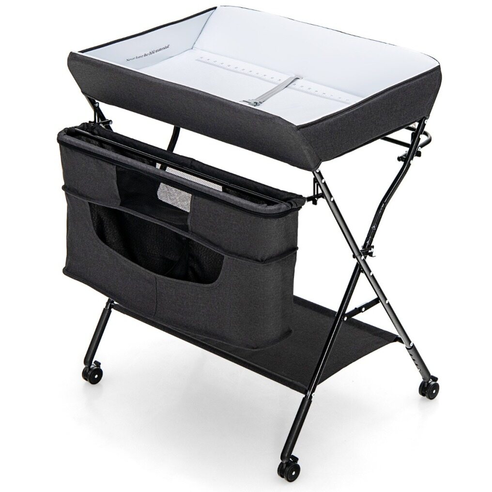 Made of reinforced X-shaped steel tube frame, wear-resistant canvas fabric and waterproof PVC fabric, this diaper changing table ensures great stability, long-lasting use as well as easy maintenance. The thick PC board and soft foam cushion inside the diaper changing pad not only provides stable support for babies, but also gives ultimate comfort. As for safety, this changing table is designed with a 4-sided fence, and a safety belt with buckles. What's more, 4 adjustable heights provide a comfortable position for parents of different heights to change baby's diapers or clothes. And it can effectively free your waist and prevent back aches. The side basket, hanging rail and bottom shelf provide large storage space for baby items. With 4 lockable and smooth rolling wheels, it is easy to move the changing table from room to room. Moreover, it can be folded up easily and stored behind your closet or in the corner when not in use.