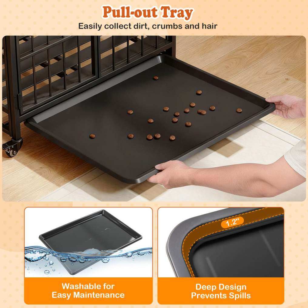 Secure Entries & Removable Tray: The metal dog kennel includes a top door for convenient interaction and a front door for easy access. All doors come with secure locks to prevent any escapes. It also features a washable removable tray to collect pet's hair or dirt. Additionally, the washable removable tray with 1.2" deep design prevents spills, ensuring a clutter-free floor.