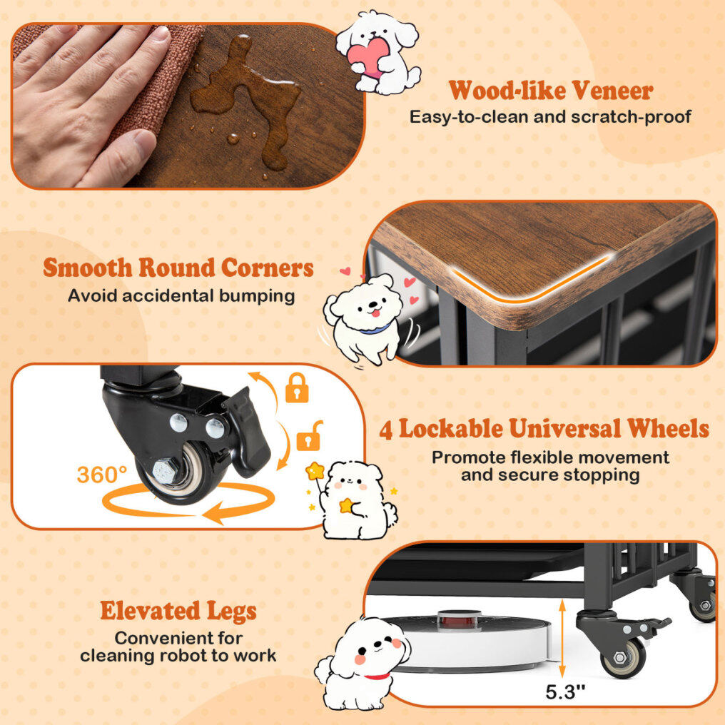 Flexible Movement: Equipped with 4 universal wheels, users can effortlessly relocate the pet house across the room. Moreover, each wheel features a brake to prevent the heavy-duty dog cage from moving when being stopped in place.
